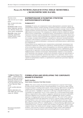 В статье рассматриваются вопросы формирования и развития стратегии корпоративного бренда, основное внимание уделяется основным элементам, которые формируют сильную идентичность бренда. В ней рассматриваются ключевые этапы создания стратегии бренда, включая анализ рынка, позиционирование бренда, дифференциацию и эффективную коммуникацию. Рассматривая роль стратегии бренда в приведении корпоративных целей в соответствие с ожиданиями рынка, подчеркивается ее важность для достижения устойчивого присутствия бренда и содействия успеху организации. Кроме того, исследуется, насколько хорошо разработанная стратегия бренда влияет на организационную культуру, усиливает взаимодействие с внутренними и внешними заинтересованными сторонами и обеспечивает согласованность всех бизнес-операций, также подчеркивается необходимость постоянной адаптации к меняющимися тенденциями рынка и предпочтениями потребителей.