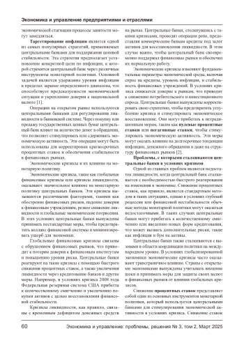 Статья посвящена анализу эффективности монетарной политики центральных банков в условиях экономических кризисов. Рассматриваются ключевые функции центральных банков, особенности их деятельности в условиях нестабильности на финансовых рынках. Особое внимание уделено анализу методов и инструментов, применяемых центральными банками для стабилизации экономики в кризисные периоды, таких как изменение процентных ставок, количественное смягчение и программы кредитования. На основе анализа исторических примеров исследуется влияние этих мер на экономику в краткосрочной и долгосрочной перспективе. В статье также обсуждаются перспективы и вызовы для монетарных властей в условиях новых экономических реалий.