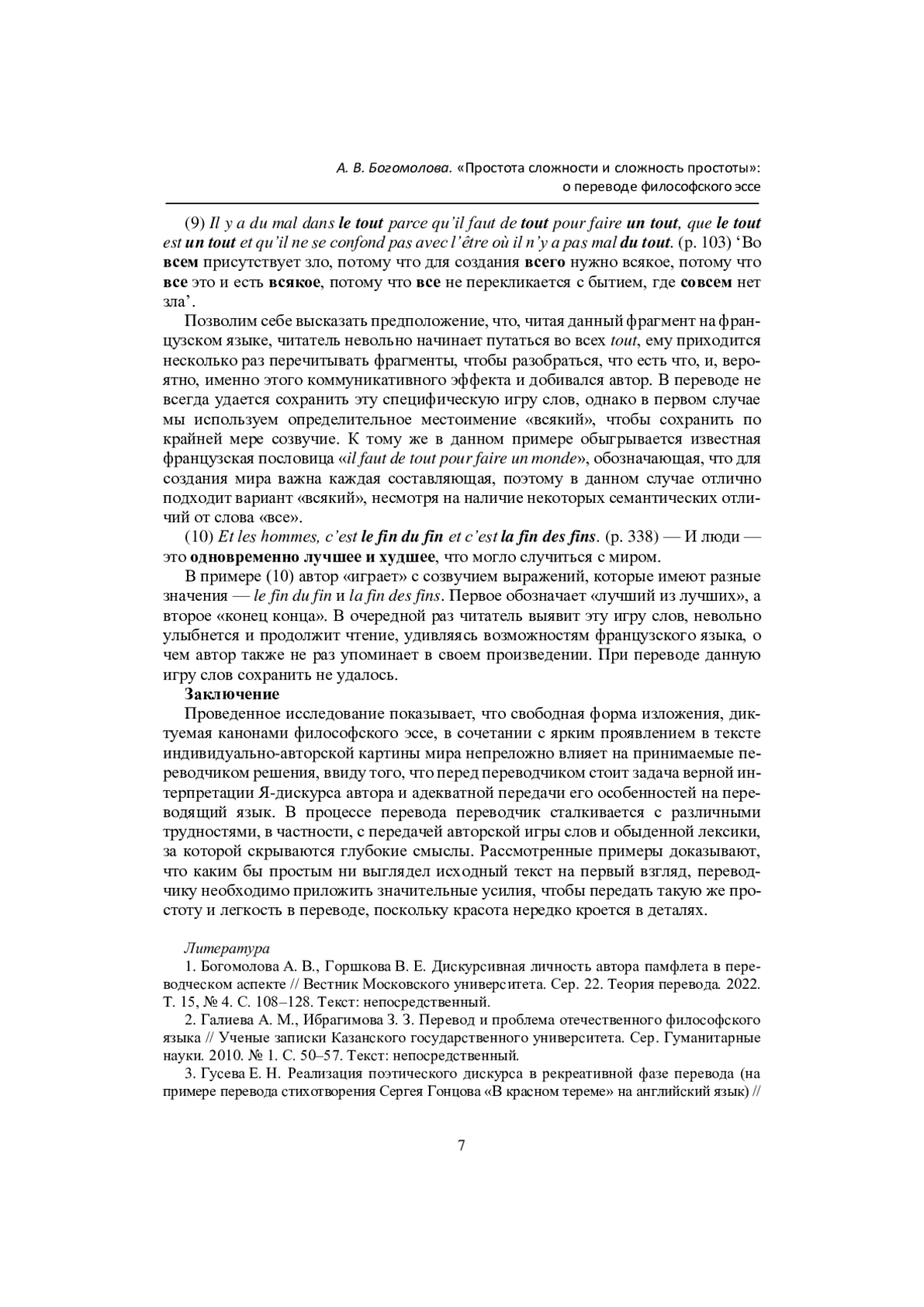 5. Курамина Н. В. “Непереводимости” в философских текстах // Вестник РГГУ. Сер. Философия. Социология. Искусствоведение. 2023. № 1. С. 161-168. Текст: непосредственный.