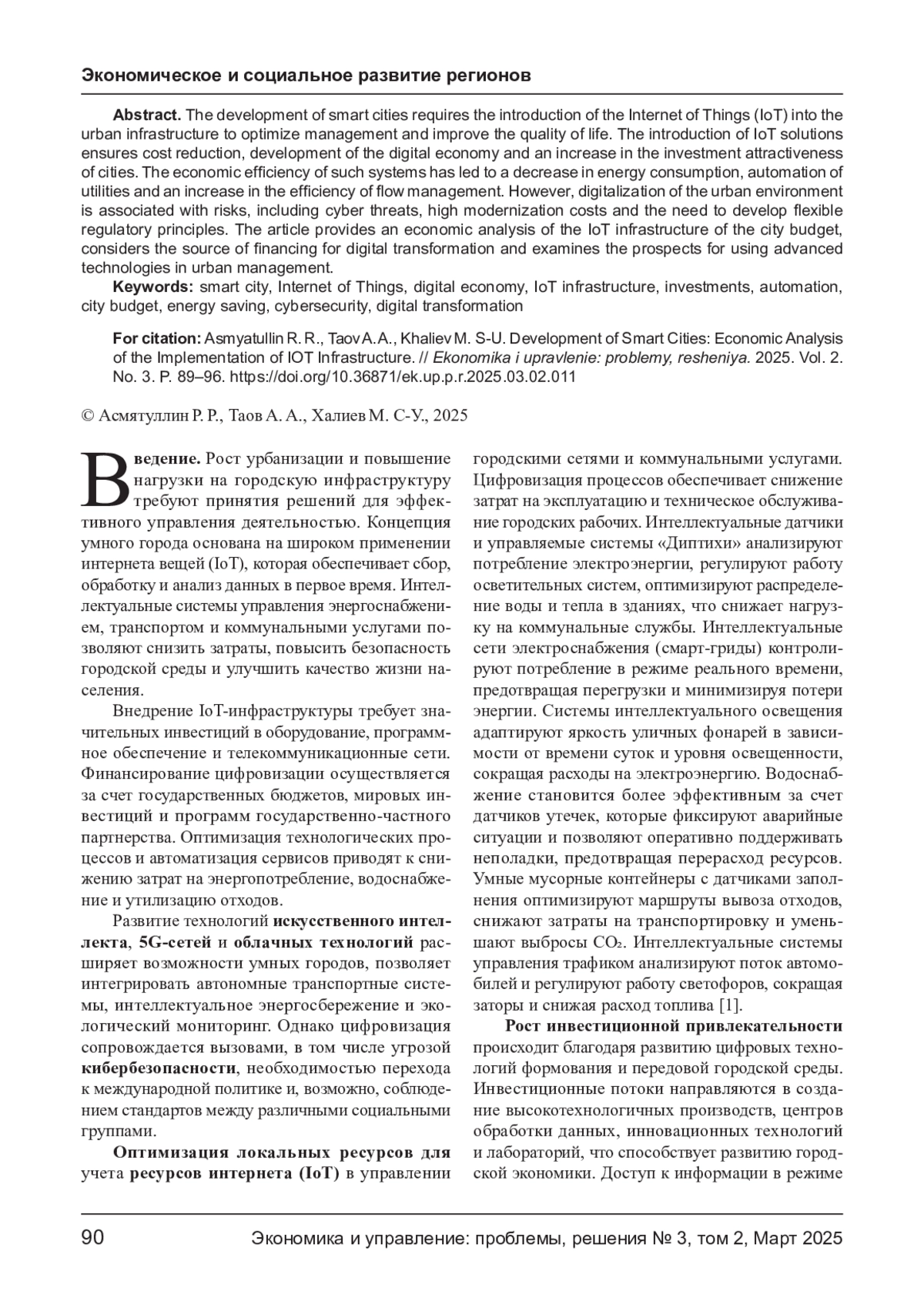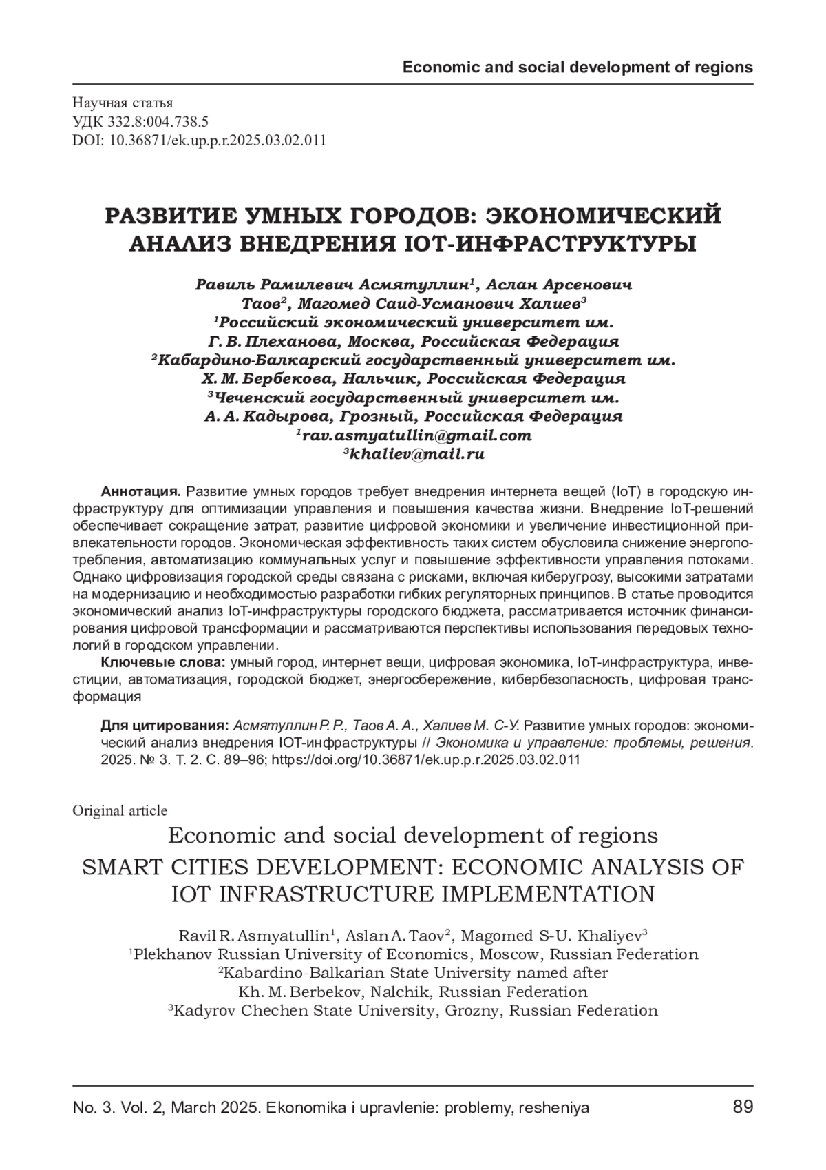 Развитие умных городов требует внедрения интернета вещей (IoT) в городскую инфраструктуру для оптимизации управления и повышения качества жизни. Внедрение IoT-решений обеспечивает сокращение затрат, развитие цифровой экономики и увеличение инвестиционной привлекательности городов. Экономическая эффективность таких систем обусловила снижение энергопотребления, автоматизацию коммунальных услуг и повышение эффективности управления потоками. Однако цифровизация городской среды связана с рисками, включая киберугрозу, высокими затратами на модернизацию и необходимостью разработки гибких регуляторных принципов. В статье проводится экономический анализ IoT-инфраструктуры городского бюджета, рассматривается источник финансирования цифровой трансформации и рассматриваются перспективы использования передовых технологий в городском управлении.