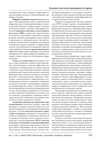 Рост энергопотребления в городах требует внедрения интеллектуальных энергосистем, направленных на оптимизацию ресурсов и повышение энергоэффективности. Использование интернета вещей (IoT), искусственного интеллекта (ИИ) и возобновляемых источников энергии позволяет снижать эксплуатационные издержки, минимизировать потери в сетях и повышать надежность энергоснабжения. В статье рассматриваются экономические аспекты внедрения новых технологий, включая анализ затрат, инвестиционной привлекательности и потенциальных рисков. Определяются ключевые финансовые механизмы цифровизации энергосистем, оцениваются перспективы государственно-частного партнерства и влияние технологической трансформации на городские бюджеты.