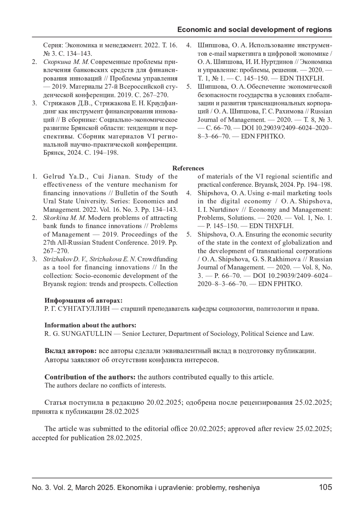 5. Шипшова, О. А. Обеспечение экономической безопасности государства в условиях глобализации и развития транснациональных корпораций / О. А. Шипшова, Г. С. Рахимова // Russian Journal of Management. - 2020. - Т. 8, № 3. - С. 66-70. DOI: 10.29039/2409-6024-2020-8-3-66-70 EDN: FPHTKO