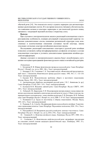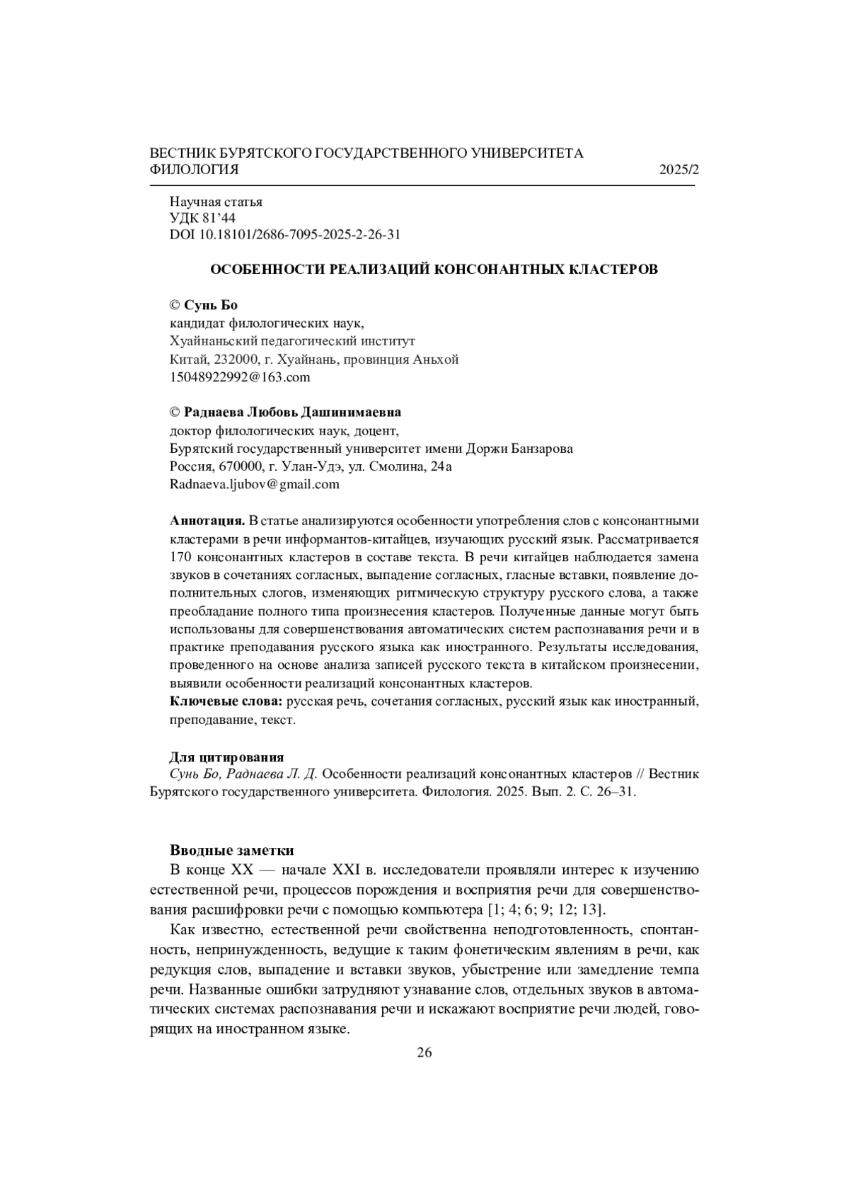 8. Раднаева Л. Д., Сунь Бо. Модификация фонем в русской речи китайцев. Теоретические и прикладные аспекты. Санкт-Петербург: Наукоемкие технологии, 2024. 176 с. Текст: непосредственный. EDN: MBGZAS