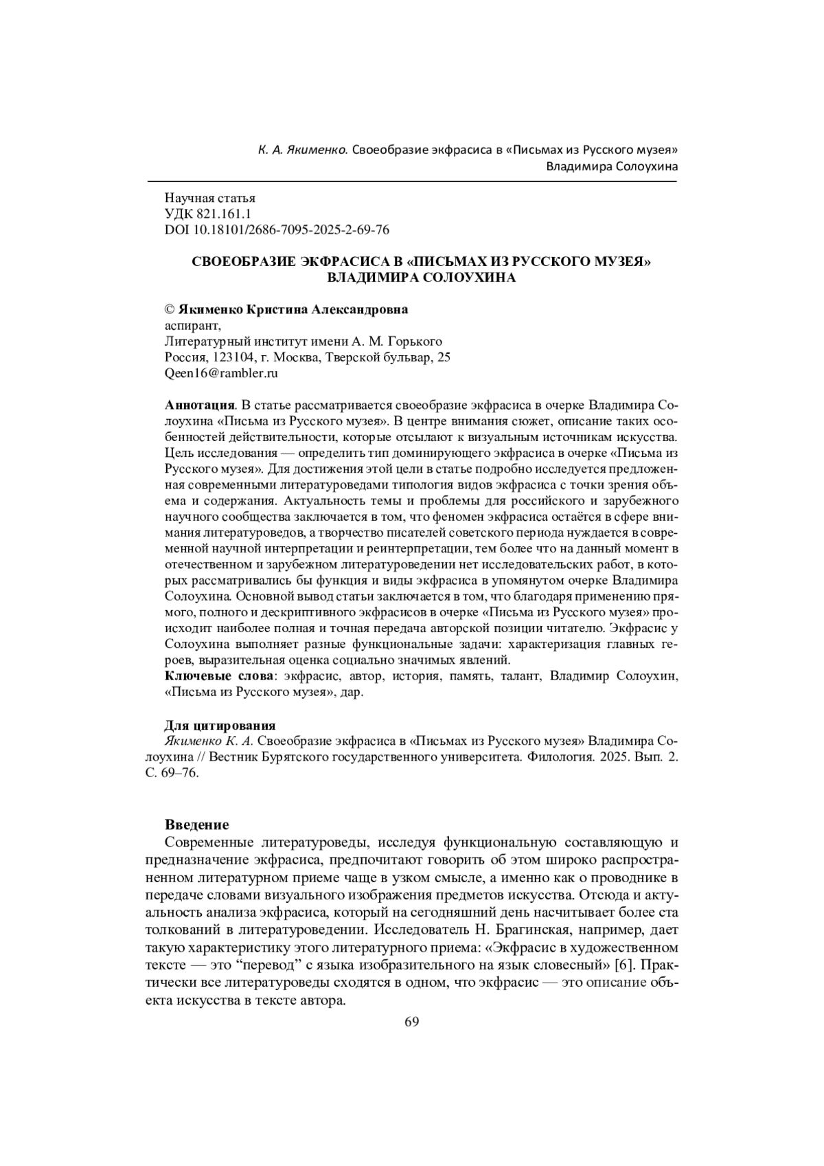 ЯКИМЕНКО К. А. СВОЕОБРАЗИЕ ЭКФРАСИСА В «ПИСЬМАХ ИЗ РУССКОГО МУЗЕЯ» ВЛАДИМИРА СОЛОУХИНА // ВЕСТНИК БУРЯТСКОГО ГОСУДАРСТВЕННОГО УНИВЕРСИТЕТА. ФИЛОЛОГИЯ. 2025. № 2
