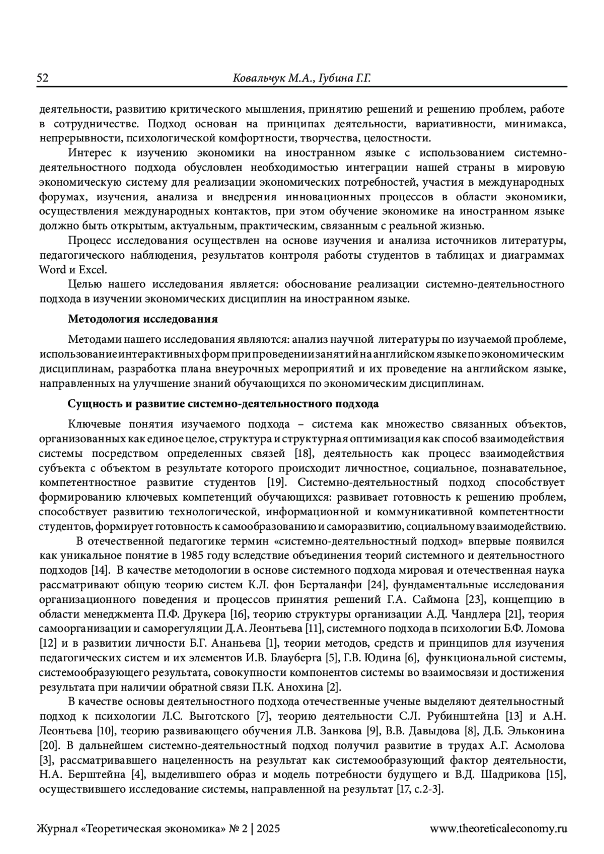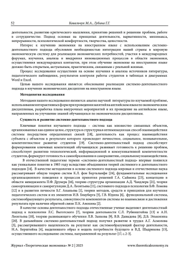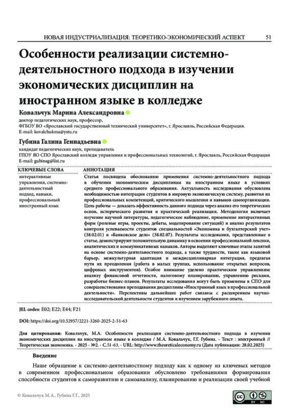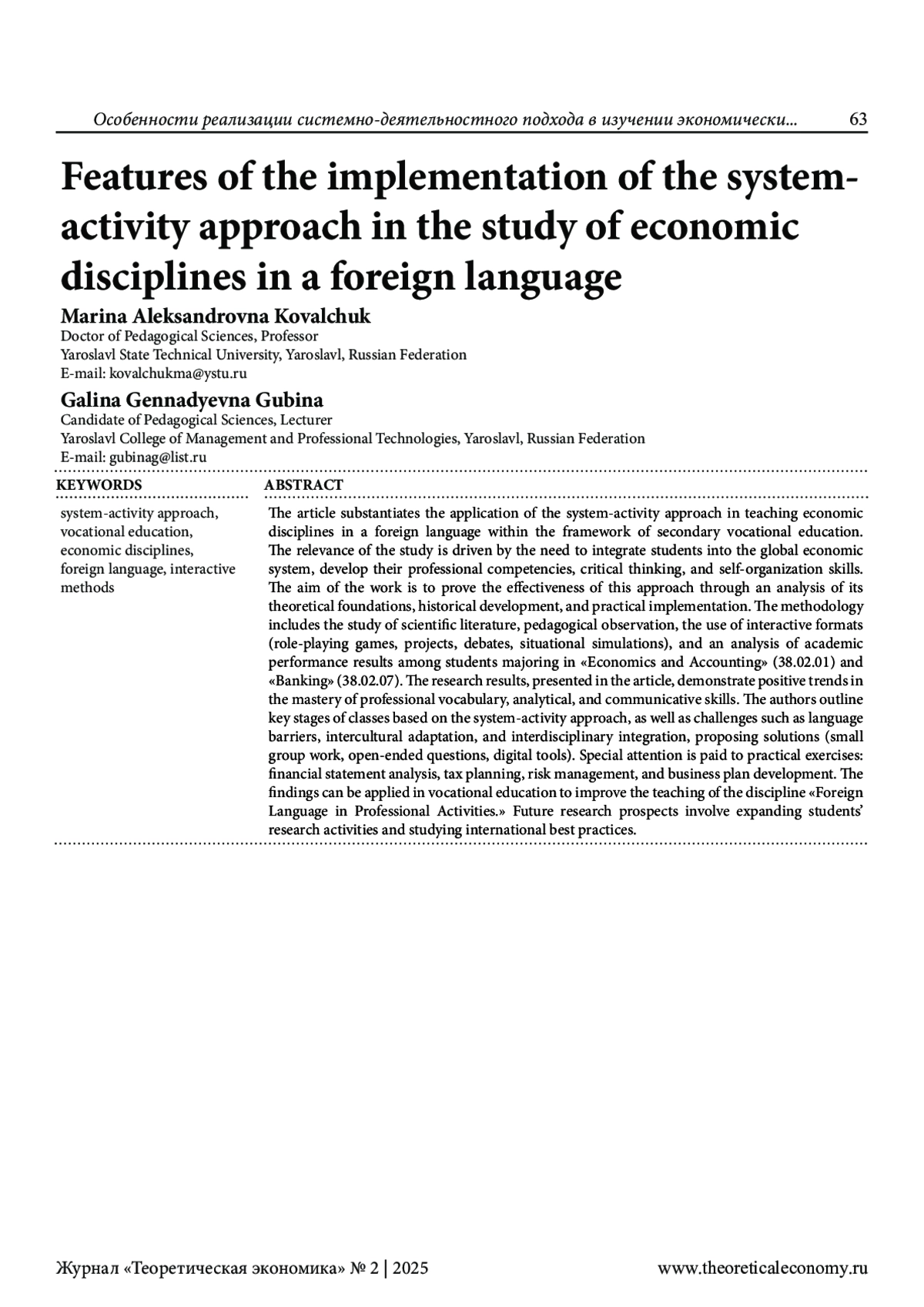 Статья посвящена обоснованию применения системно-деятельностного подхода в обучении экономическим дисциплинам на иностранном языке в условиях среднего профессионального образования. Актуальность исследования обусловлена необходимостью интеграции студентов в мировую экономическую систему, развития их профессиональных компетенций, критического мышления и навыков самоорганизации. Цель работы - доказать эффективность данного подхода через анализ его теоретических основ, исторического развития и практической реализации. Методология включает изучение научной литературы, педагогическое наблюдение, применение интерактивных форм (ролевые игры, проекты, дебаты, моделирование ситуаций) и анализ результатов контроля успеваемости студентов специальностей «Экономика и бухгалтерский учет» (38.02.01) и «Банковское дело» (38.02.07). Результаты исследования, представленные в статье, демонстрируют положительную динамику в освоении профессиональной лексики, аналитических и коммуникативных навыков. Авторы выделяют ключевые этапы занятий на основе системно-деятельностного подхода, а также трудности, такие как языковой барьер, межкультурная адаптация и междисциплинарная интеграция, предлагая пути их преодоления (работа в малых группах, использование открытых вопросов, цифровых инструментов). Особое внимание уделено практическим упражнениям: анализу финансовой отчетности, налоговому планированию, управлению рисками, разработке бизнес-планов. Результаты исследования могут быть применены в СПО для совершенствования преподавания дисциплины «Иностранный язык в профессиональной деятельности». Перспективы дальнейших работ связаны с расширением научно-исследовательской деятельности студентов и изучением зарубежного опыта.