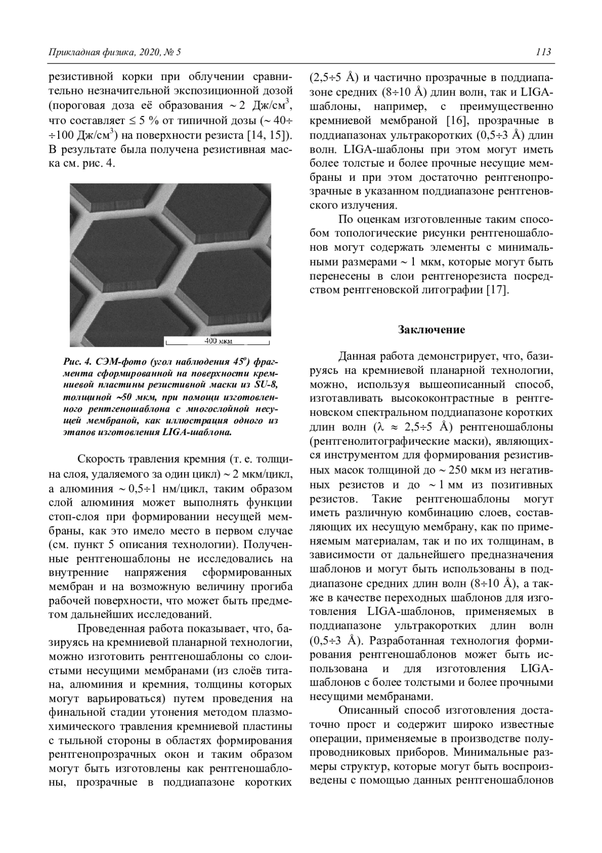 Описаны конструкция и способ изготовления высококонтрастных в рентгеновском спектральном поддиапазоне коротких длин волн ( 2,55 Å) рентгеношаблонов, являющихся инструментом для формирования резистивных масок толщиной до 250 мкм из негативных и до 1 мм из позитивных резистов. Данные рентгеношаблоны могут быть также использованы в поддиапазоне средних длин волн (810 Å) и в качестве переходных шаблонов при изготовлении LIGA-шаблонов, применяемых в поддиапазоне ультракоротких длин волн (0,53 Å). Способ изготовления базируется на кремниевой планарной технологии. Были изготовлены два вида шаблонов с преимущественно алюминиевой мембраной. Проведенная работа показывает, что, базируясь на данной технологии, можно изготавливать рентгеношаблоны и LIGAшаблоны со слоистыми несущими мембранами, выполненными из слоёв сравнительно легких материалов типа титана, алюминия, кремния и т. п., толщины которых могут варьироваться в зависимости от предназначения шаблона.