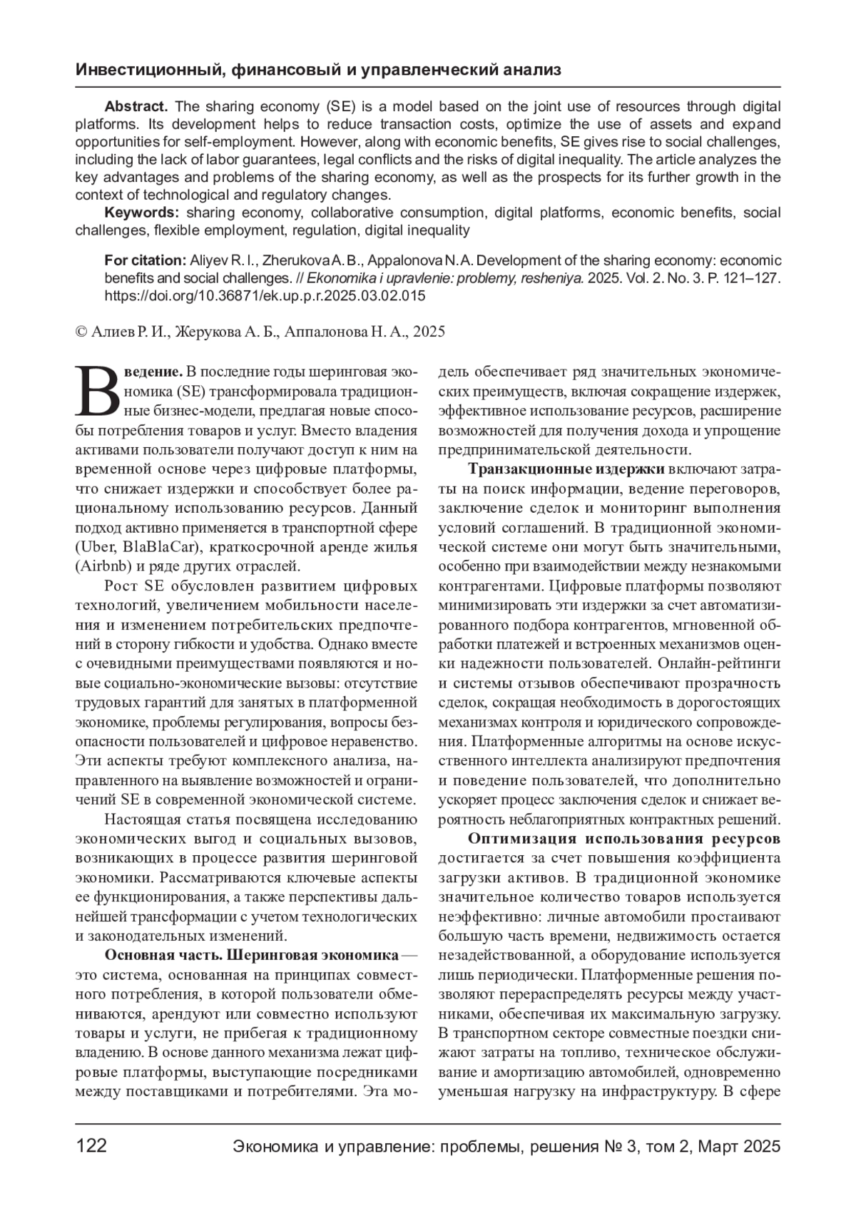 Шеринговая экономика (SE) представляет собой модель, основанную на совместном использовании ресурсов через цифровые платформы. Ее развитие способствует снижению транзакционных издержек, оптимизации использования активов и расширению возможностей для самозанятости. Однако наряду с экономическими выгодами SE порождает социальные вызовы, включая отсутствие трудовых гарантий, правовые коллизии и риски цифрового неравенства. В статье анализируются ключевые преимущества и проблемы шеринговой экономики, а также перспективы ее дальнейшего роста в контексте технологических и регуляторных изменений.