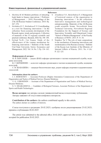 4. Артюхова В.О., Щербакова Н. А. Управление заемными источниками организации при финансировании инноваций // В сборнике: Инновационный менеджмент и технологическое предпринимательство. Материалы Всероссийского молодежного научного форума. Новосибирский государственный технический университет, Новосибирский областной фонд поддержки науки и инновационной деятельности, НОЦ “Школа современного управления” факультета бизнеса НГТУ. 2015. С. 31-34. EDN: VLHIZR