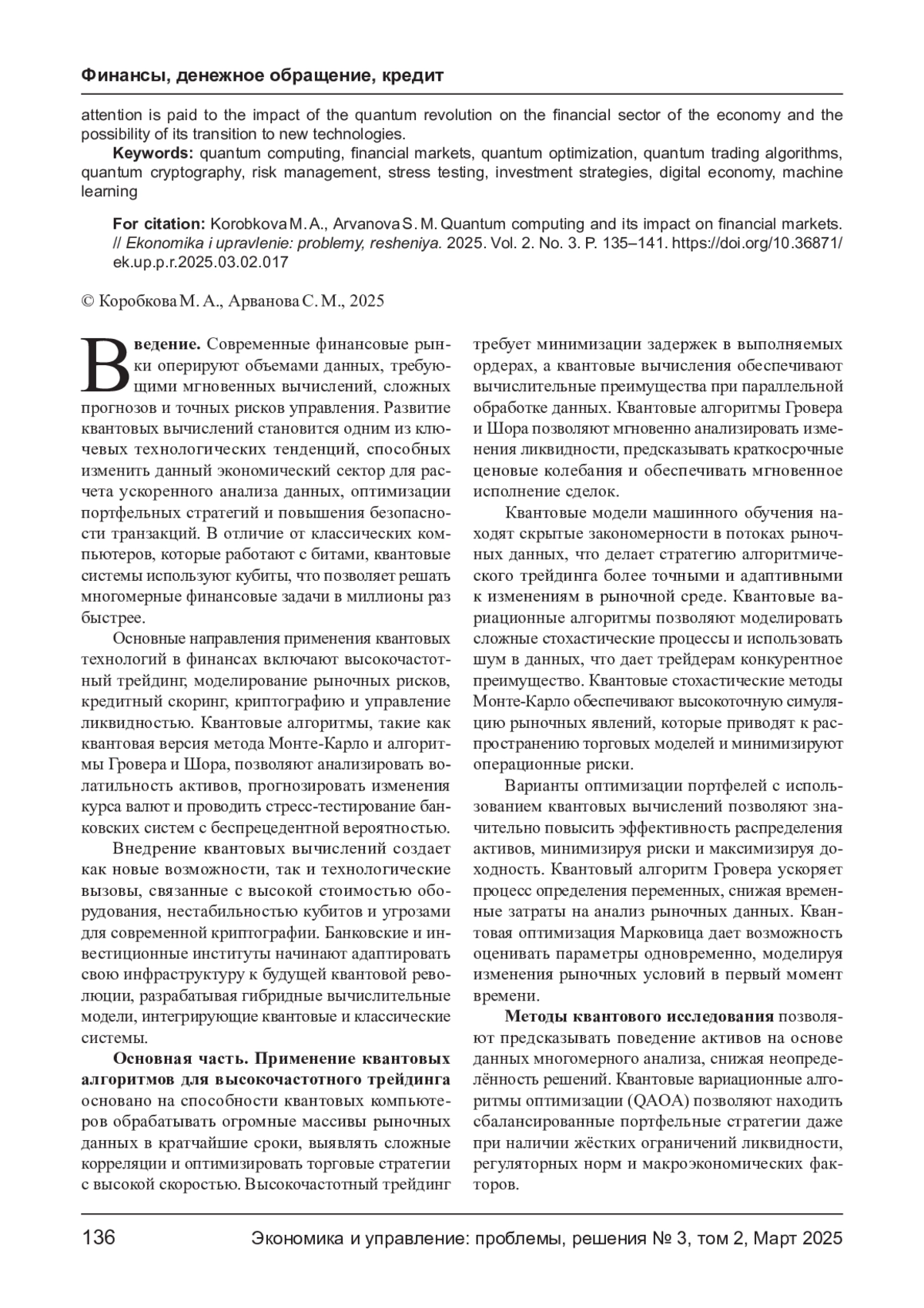 Развитие квантовых связей открывает новые возможности для финансовых рынков, способствует ускоренной обработке данных, оптимизации стратегий и повышению эффективности управления рисками. Квантовые алгоритмы, обладая экспоненциальной вычислительной мощностью, способны решать задачи, имеющиеся для классических компьютеров, что делает их перспективными для высокочастотного трейдинга, стресс- тестирования банковских систем и анализа ликвидности. Внедрение квантовой криптографии и оптимизационных алгоритмов меняет подход к безопасности финансовых операций и прогнозированию динамики активов. В статье рассматриваются основные направления использования квантовых компьютеров в финансах, анализируются их последствия, потенциальные угрозы и регуляторные вызовы. Особое внимание уделяется влиянию квантовой революции на финансовый сектор экономики и возможности ее перехода к новым технологиям.