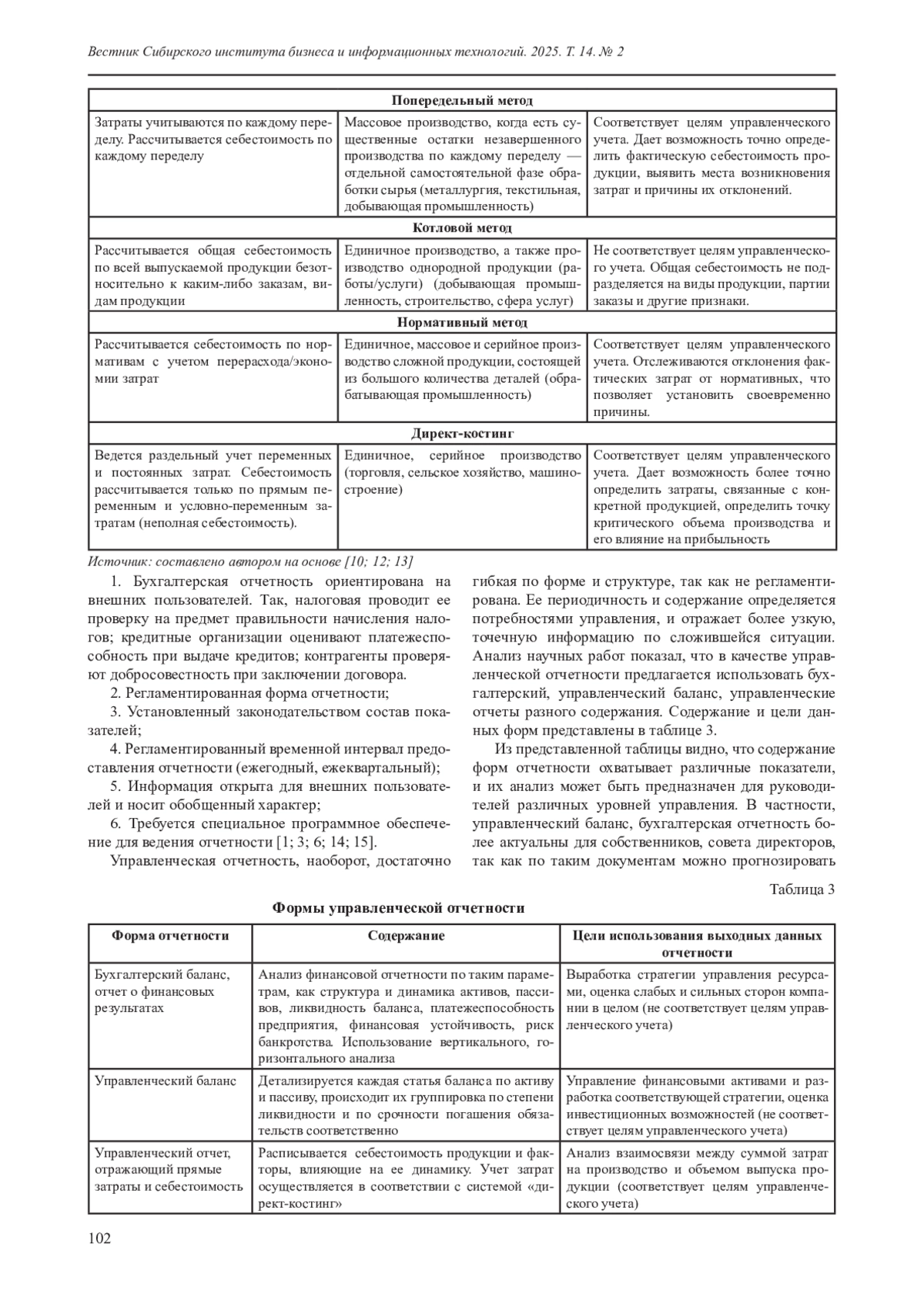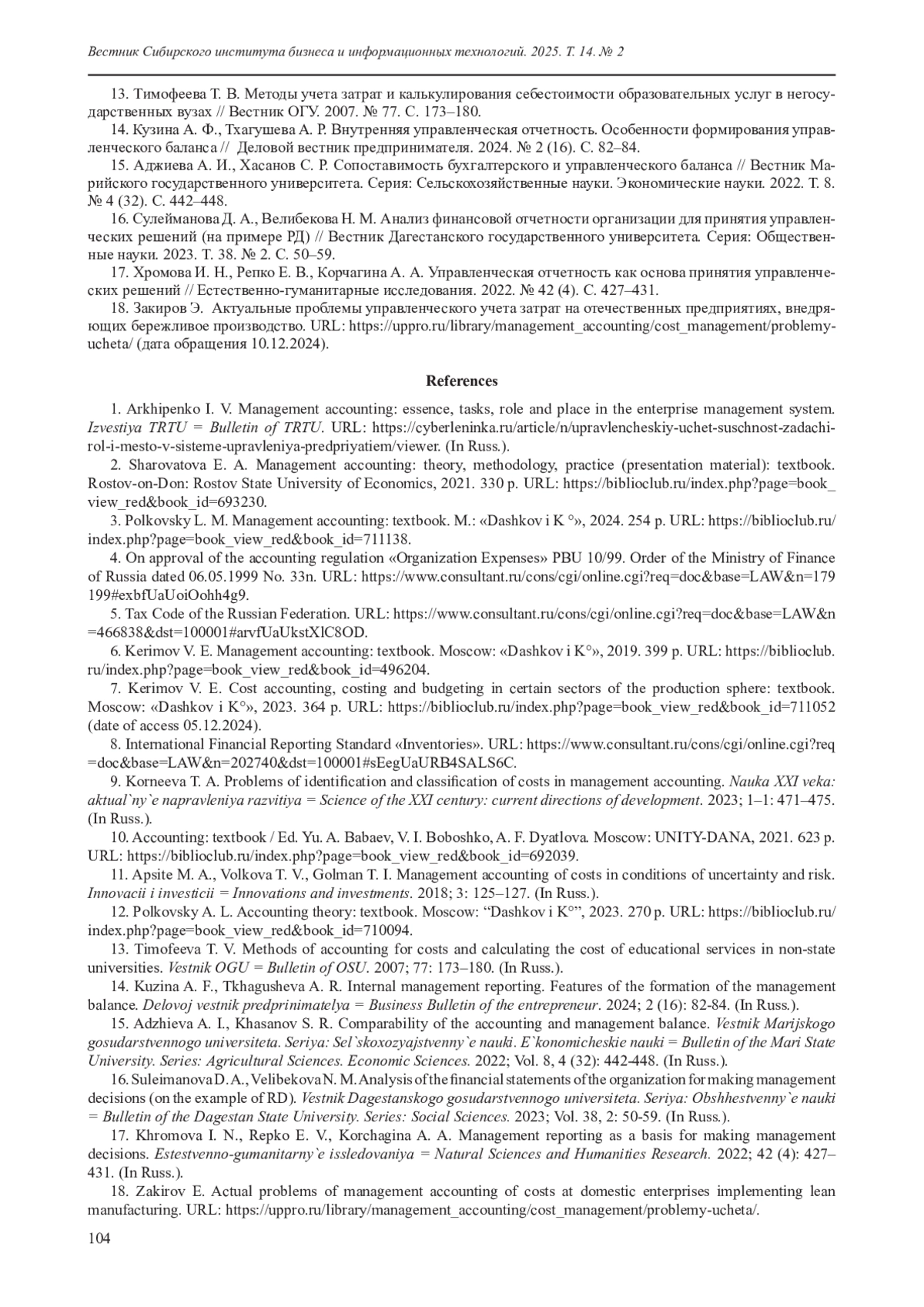 КОЛОМЕЕЦ Н. В. ОСОБЕННОСТИ ИСПОЛЬЗОВАНИЯ КЛАССИФИКАЦИИ, МЕТОДОВ КАЛЬКУЛИРОВАНИЯ И ФОРМ ОТЧЕТНОСТИ В УПРАВЛЕНЧЕСКОМ УЧЕТЕ ЗАТРАТ КОМПАНИИ // ВЕСТНИК СИБИРСКОГО ИНСТИТУТА БИЗНЕСА И ИНФОРМАЦИОННЫХ ТЕХНОЛОГИЙ. 2025. ТОМ 14, № 2
