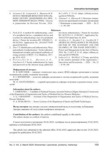 4. Алешков А. В., Синюков В. А., Ивашкин М. В. ИСКУССТВЕННЫЙ ИНТЕЛЛЕКТ В РЕАЛЬНОМ СЕКТОРЕ ЭКОНОМИКИ (НА ПРИМЕРЕ ПИЩЕВОЙ ИНДУСТРИИ) // Власть и управление на Востоке России. 2024. № 2 (107). С. 51-63. (item.asp?id=67999220). EDN: LVZVTN