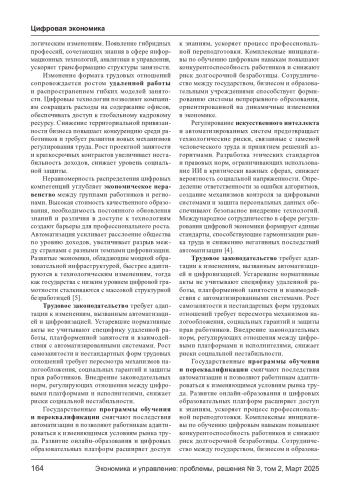 В условиях цифровой трансформации экономики автоматизация становится ключевым фактором, изменяющим структуру традиционного рынка труда. В статье рассматривается влияние современных цифровых технологий, таких как искусственный интеллект, роботизация и алгоритмическое управление, на занятость и профессиональную структуру. Анализируются риски потери рабочих мест, появление новых профессий и изменение требований к квалификации работников. Особое внимание уделяется социально- экономическим последствиям цифровизации, включая рост неравенства и необходимость адаптации системы образования. Также рассматриваются возможные стратегии государственного регулирования и прогнозы развития рынка труда в ближайшие десятилетия.