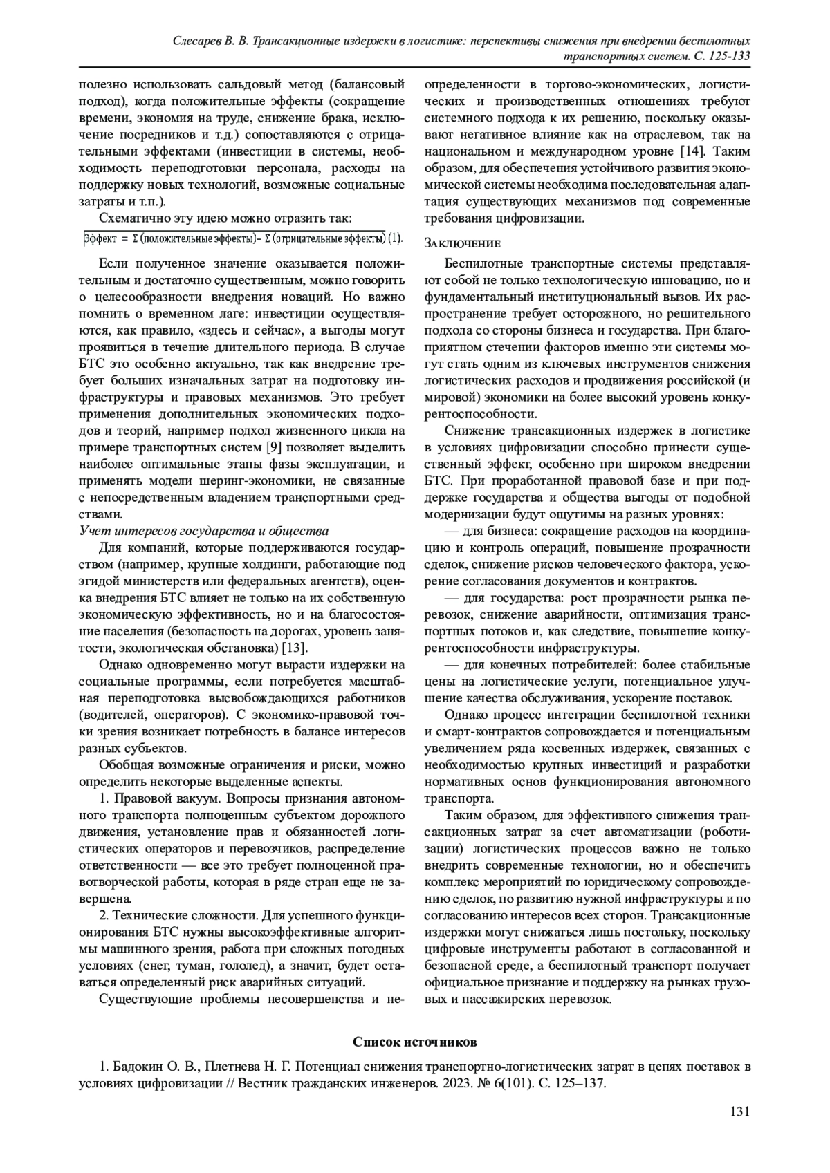 1. Бадокин О. В., Плетнева Н. Г. Потенциал снижения транспортно-логистических затрат в цепях поставок в условиях цифровизации // Вестник гражданских инженеров. 2023. № 6(101). С. 125-137.