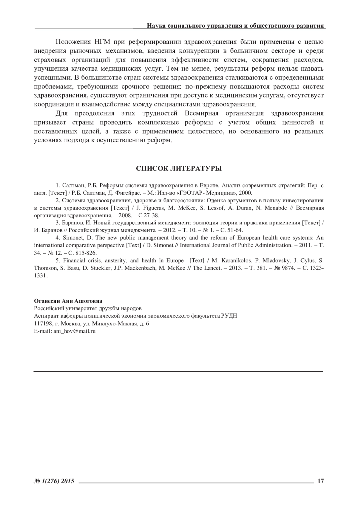 4. Simonet, D. The new public management theory and the reform of European health care systems: An international comparative perspective [Text] / D. Simonet // International Journal of Public Administration. - 2011. - T. 34. - № 12. - C. 815-826.