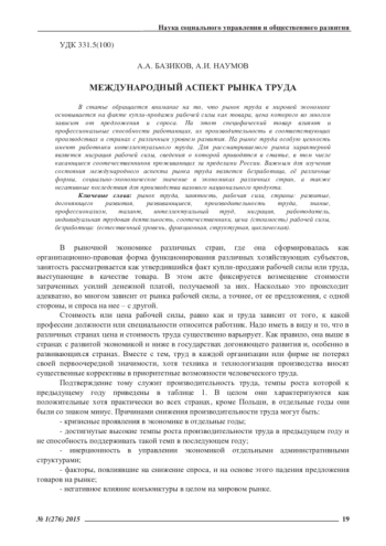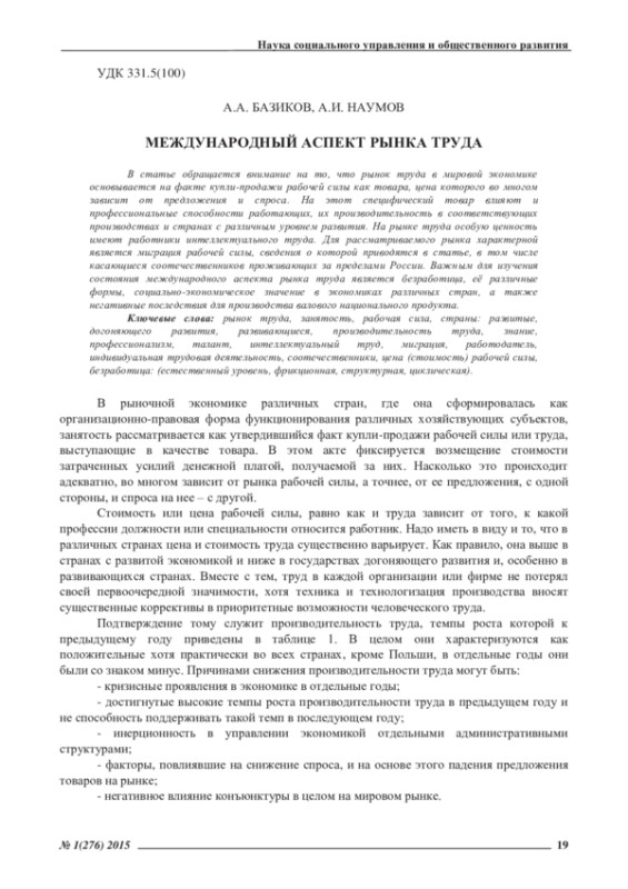 В статье обращается внимание на то, что рынок труда в мировой экономике основывается на факте купли-продажи рабочей силы как товара, цена которого во многом зависит от предложения и спроса. На этот специфический товар влияют и профессиональные способности работающих, их производительность в соответствующих производствах и странах с различным уровнем развития. На рынке труда особую ценность имеют работники интеллектуального труда. Для рассматриваемого рынка характерной является миграция рабочей силы, сведения о которой приводятся в статье, в том числе касающиеся соотечественников проживающих за пределами России. Важным для изучения состояния международного аспекта рынка труда является безработица, её различные формы, социально-экономическое значение в экономиках различных стран, а также негативные последствия для производства валового национального продукта