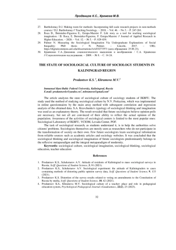 4. Проданцов К.С., Храмова М.В. Социологическая культура педагога: место и роль в системе педагогического образования / К.С. Проданцов, М.В. Храмова // Психолого-педагогический журнал Гаудеамус. - 2023. - Т. 22. - № 2. - С. 23-35. EDN: RSFIOS