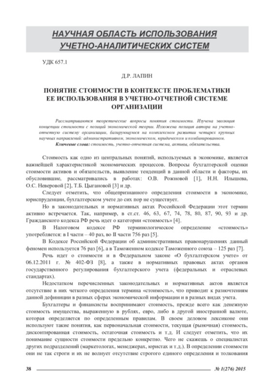 Рассматриваются теоретические вопросы понятия стоимости. Изучена эволюция концепции стоимости с позиций экономической теории. Изложена позиция автора на учетноотчетную систему организации, базирующуюся на комплексном развитии четырех крупных научных направлений: административном, экономическом, юридическом и комбинированном