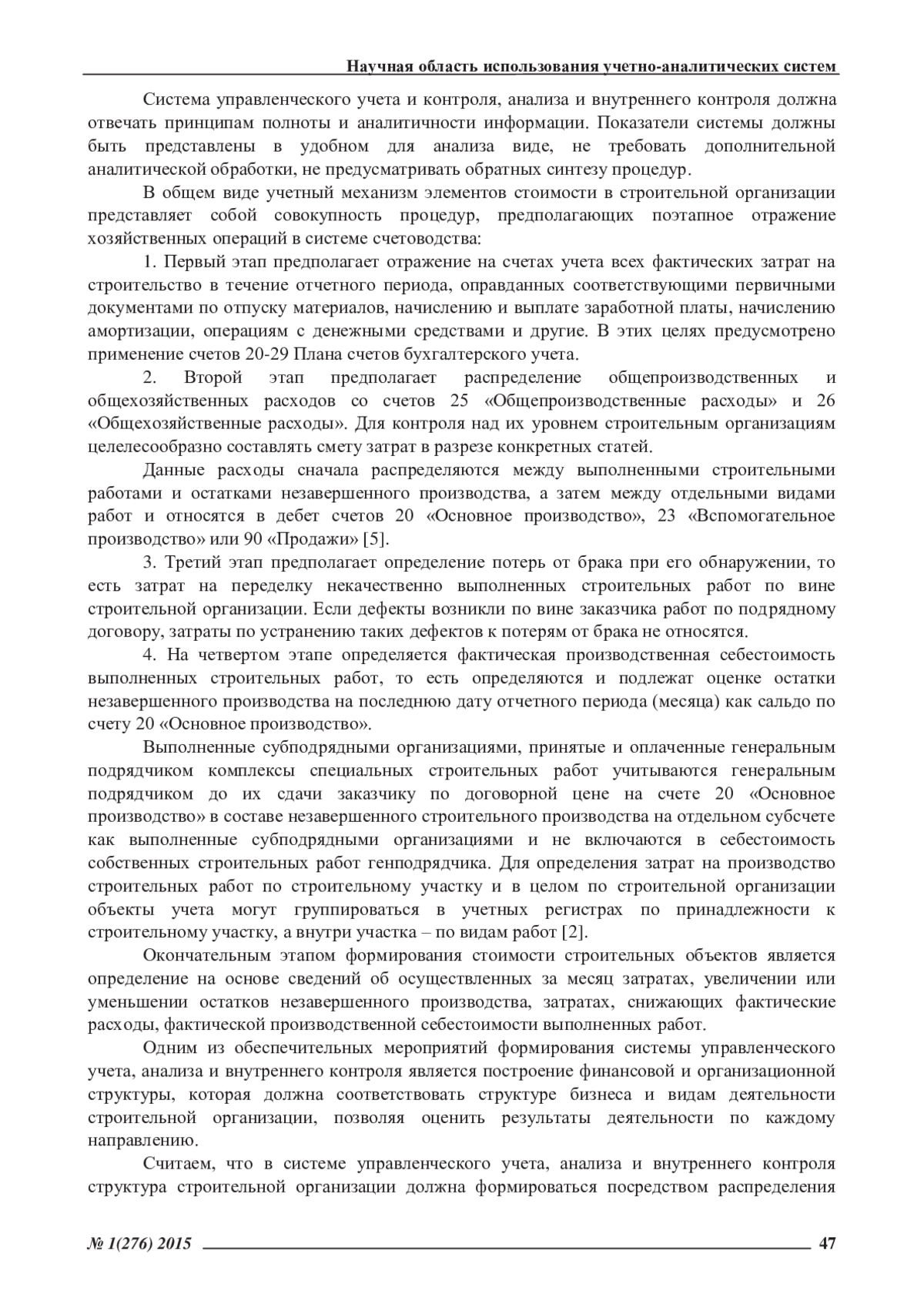 Финансово-хозяйственная деятельность строительных организаций предопределяет выделение особенностей формирования системы управленческого учета, анализа и внутреннего контроля, характерных для строительной отрасли