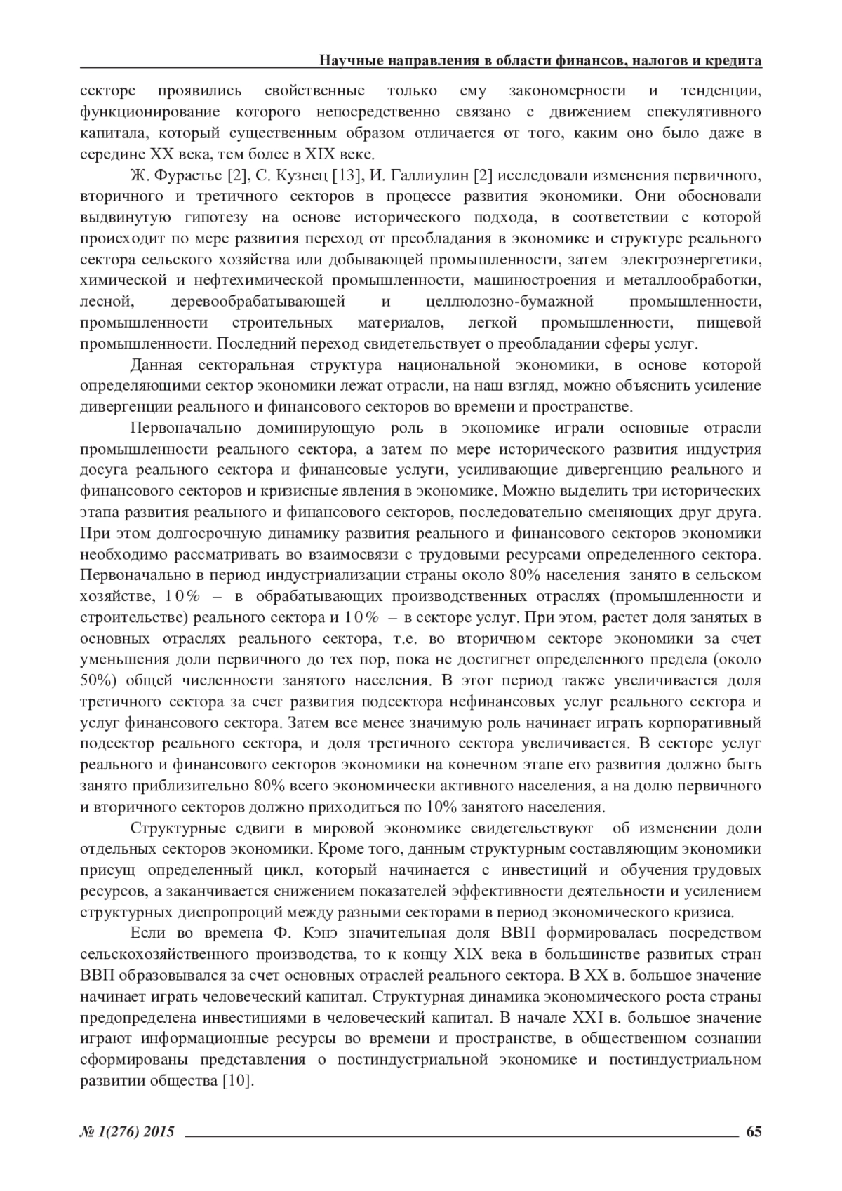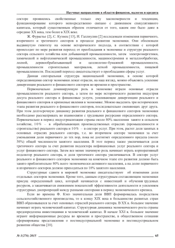 В статье анализируется развитие реального и финансового секторов экономики на основе исторического подхода. Выявляются изменения структуры реального и финансового секторов экономики благодаря развитию сферы услуг реального сектора, а также важные закономерности особенностей развития национального и мирового хозяйств, вызванные динамикой спроса и динамикой производительности труда. Определяются важные закономерности развития услуг реального и финансового секторов экономики в мировом хозяйстве