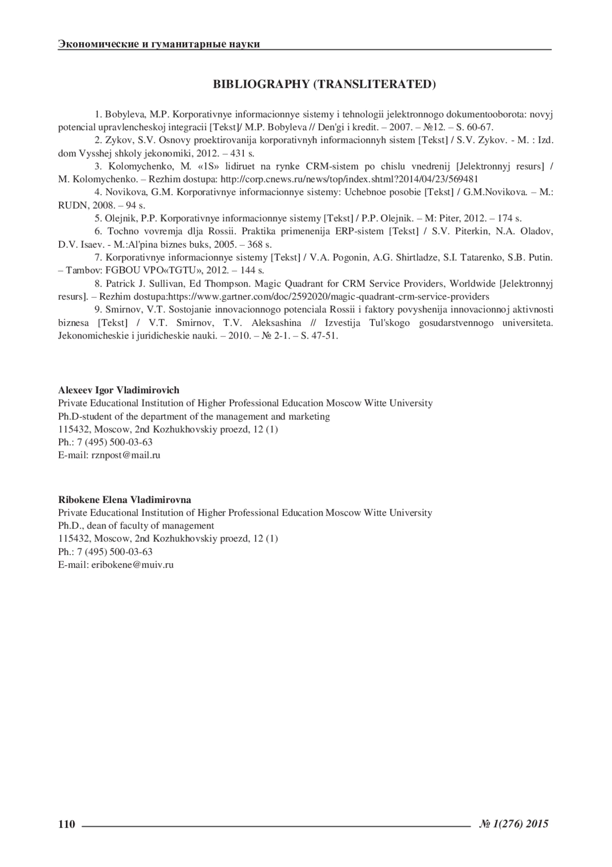 1. Бобылева, М.П. Корпоративные информационные системы и технологии электронного документооборота: новый потенциал управленческой интеграции [Текст]/ М.П. Бобылева // Деньги и кредит. - 2007. - №12. - С. 60-67. EDN: KUDLIR