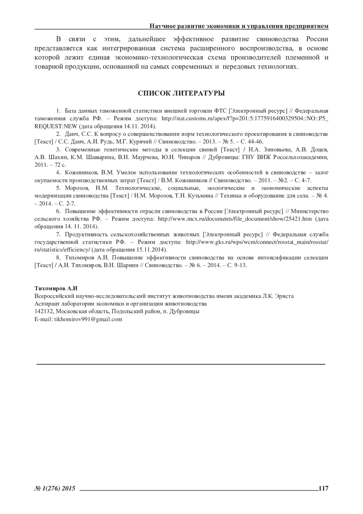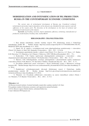 8. Тихомиров А.И. Повышение эффективности свиноводства на основе интенсификации селекции /А.И. Тихомиров, В.Н. Шарнин//Свиноводство. -№ 6. -2014. -С. 9-13. EDN: SNZTTF