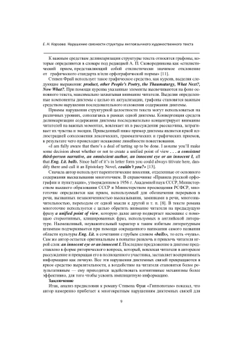 Современные лингвистические теории и подходы к исследованиям текста и его категорий открывают новые возможности интерпретации категории связности по отношению к художественному тексу. Актуальность данной темы обусловливается неизученностью средств семантико-синтаксических нарушений текстовой связности как факторов влияния на восприятие читателем художественного текста.