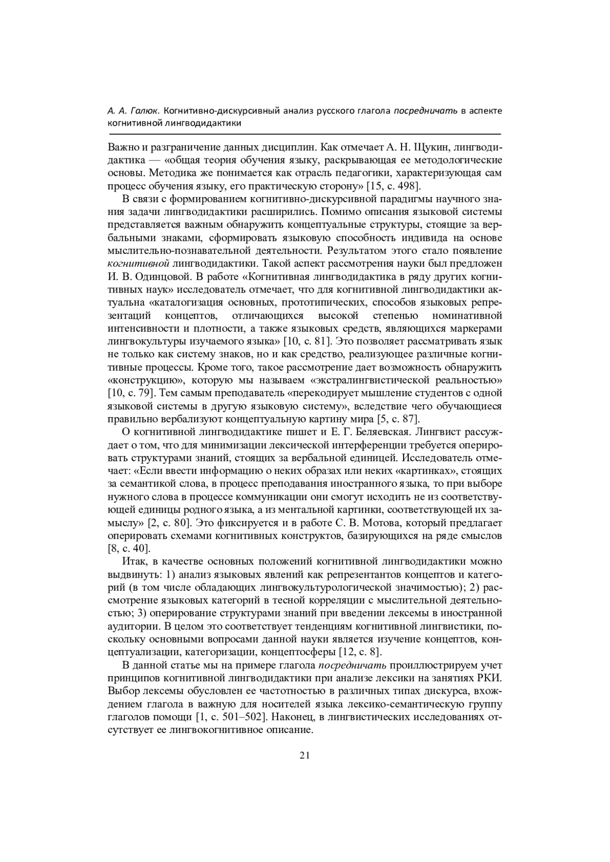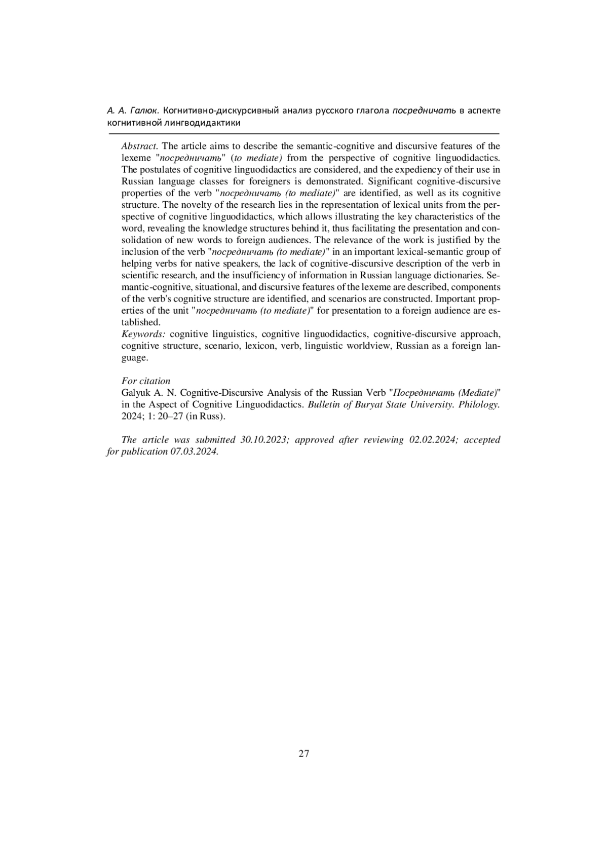 Целью статьи явилось описание семантико-когнитивных и дискурсивных особенностей лексемы посредничать с позиции когнитивной лингводидактики. Рассматриваются постулаты когнитивной лингводидактики, доказывается целесообразность их использования на занятиях русским языком как иностранным. Выявляются значимые когнитивно-дискурсивные свойства глагола посредничать, а также его когнитивная структура. Новизна исследования видится в том, что представление лексических единиц с позиции когнитивной лингводидактики дает возможность проиллюстрировать ключевые характеристики слова, обнаружить стоящие за ним структуры знания, что облегчает представление и закрепление новых слов в иностранной аудитории. Актуальность работы обусловлена вхождением глагола посредничать в важную для носителей языка лексико-семантическую группу глаголов помощи, отсутствием когнитивно-дискурсивного описания глагола в научных исследованиях, недостаточностью информации в словарях русского языка. Описываются семантико-когнитивные, ситуативные и дискурсивные признаки лексемы, выявляются компоненты когнитивной структуры глагола, конструируются сценарии. Устанавливаются важные для предъявления в иностранной аудитории свойства единицы посредничать.