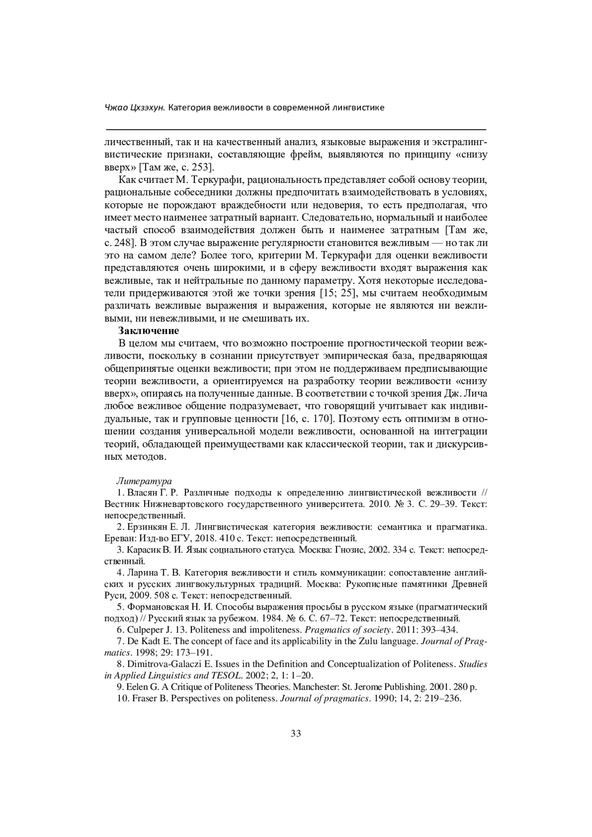 1. Власян Г. Р. Различные подходы к определению лингвистической вежливости // Вестник Нижневартовского государственного университета. 2010. № 3. С. 29-39. Текст: непосредственный. EDN: OXYMER