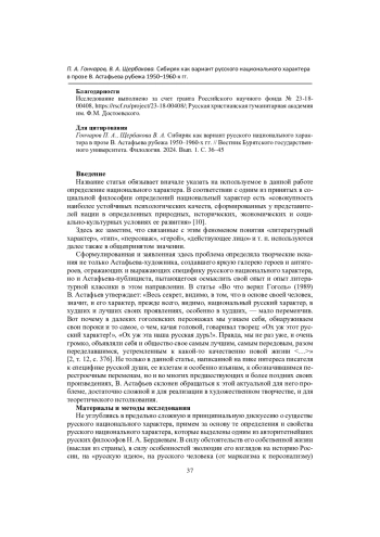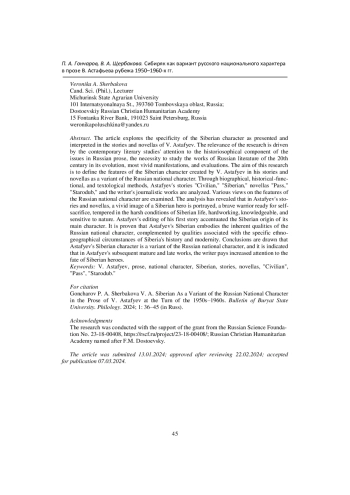 В статье исследуется специфика характера сибиряка, представленная и осмысленная в рассказах и повестях В. Астафьева. Актуальность исследования обусловлена вниманием современного литературоведения к историософской составляющей проблематике русской прозы, необходимостью изучения произведений русской литературы ХХ в. в ее эволюции, наиболее ярких проявлениях и оценках. Целью данного исследования является определение особенностей созданного в рассказах и повестях В. Астафьева характера сибиряка в качестве варианта русского национального характера. С помощью биографического, историко-функционального и текстологического методов анализируются рассказы В. Астафьева «Гражданский человек», «Сибиряк», повести «Перевал», «Стародуб», публицистические произведения писателя. Рассматриваются различные взгляды на особенности русского национального характера. В результате проведенного анализа установлено, что в рассказах и повестях В. Астафьева создан яркий образ героя-сибиряка, храброго воина, готового к самопожертвованию, закаленного в суровых условиях жизни Сибири, трудолюбивого, знающего и чувствующего природу. Редактирование Астафьевым его первого рассказа шло по пути акцентирования сибирского происхождения его главного героя. Доказано, что астафьевский сибиряк заключает в себе коренные свойства русского национального характера, дополненные качествами, связанными с особыми этногеографическими обстоятельствами истории и современности Сибири. Сделаны выводы о том, что астафьевский сибиряк является вариантом русского национального характера, указано, что в последующем зрелом и позднем творчестве В. Астафьева усилено внимание писателя к судьбе героев-сибиряков.
