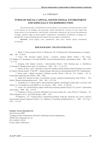 В статье приведена классификация социального капитала по двум основаниям, особое внимание уделено его разделению на объединяющий и разобщающий. Дано понятие и выявлены особенности воспроизводства социального капитала, к числу которых относится, в частности, определяющая роль доверия и несимметричность обмена. Проанализированы стадии воспроизводства социального капитала: накопление, распределение, обмен, использование. Раскрыто понятие институциональной среды воспроизводства социального капитала