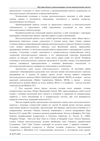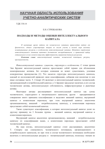 Интеллектуальный капитал: сущность, структура и особенности. С точки зрения Энн Брукинг интеллектуальный капитал представляет собой термин для обозначения нематериальных активов, без которых компания не может существовать, усиливая конкурентные преимущества [1]. Что касается структуры интеллектуального капитала, каждый из исследователей приводит свою классификацию, добавляя или исключая те или иные составные части. Т. Стюарт [5] включает в интеллектуальный капитал человеческий, организационный и потребительский капитал; а Э. Брукинг предлагает включать в его состав человеческие активы, интеллектуальную собственность, инфраструктурные и рыночные активы