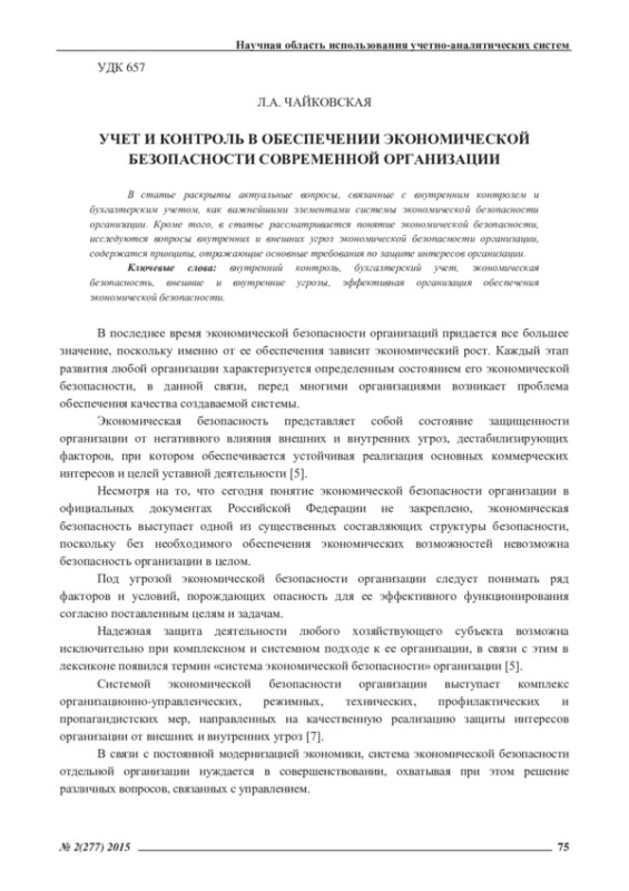 В статье раскрыты актуальные вопросы, связанные с внутренним контролем и бухгалтерским учетом, как важнейшими элементами системы экономической безопасности организации. Кроме того, в статье рассматривается понятие экономической безопасности, исследуются вопросы внутренних и внешних угроз экономической безопасности организации, содержатся принципы, отражающие основные требования по защите интересов организации