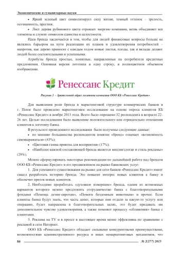 Бренд – это образ, который сложился у потребителя, уникальный и привлекательный символ, руководствуясь которым он осуществляет свой выбор. В условиях рынка банковские структуры все ожесточеннее ведут борьбу за потребителей, и в этом направлении одним из главных механизмов для привлечения клиентов является бренд. В статье рассмотрены основные особенности отечественного брендинга в банковской сфере, выведены закономерности конструирования визуального и словесного «образов» компании на примере ООО КБ «Ренессанс Кредит»