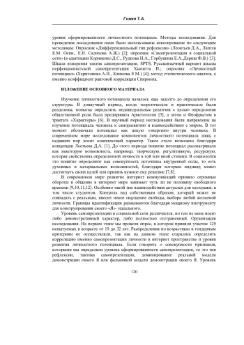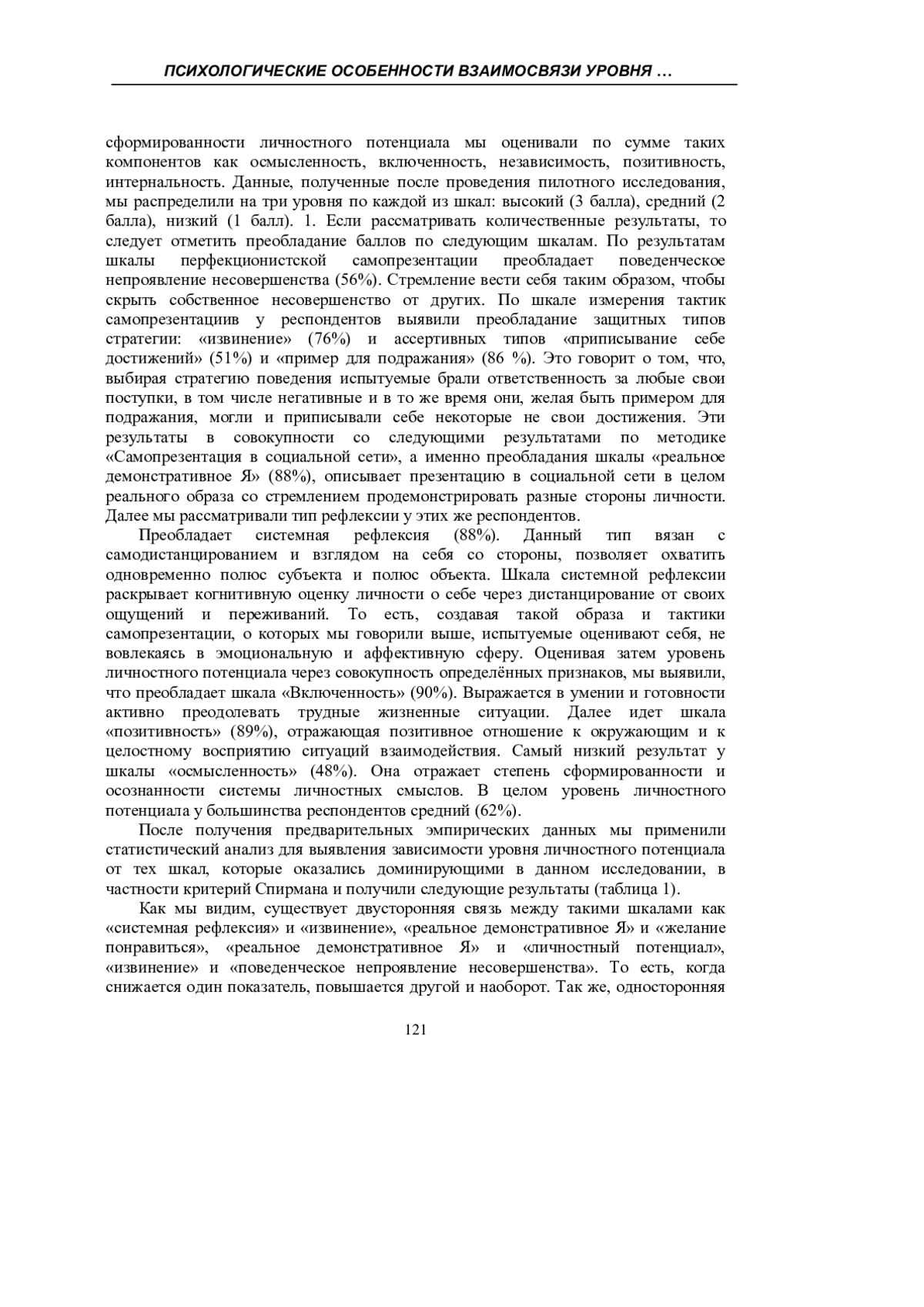 В статье рассмотрены понятия личностный потенциал, саморефлексия, самопрезентация в интернет пространстве. Проанализирована современная и классическая литература по изучению понятия личностного потенциала и его компонентов. Проведено исследование с целью доказать предположение о том, что уровень развития совокупности признаков, определяющих самопрезентацию личности в интернете не зависит от уровня сформированности личностного потенциала. Выявили, что проявление личностного потенциала в интернет пространстве имеет ряд особенностей, связанных с его компонентами, что и в реальной жизни. В конце приведены актуальные выводы согласно результатам исследования.