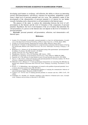 3. Корниенко Д. С. Особенности самопрезентации в социальной сети в связи с чертами большой пятерки и темной триады / А.Ж. Аверина, Н.А., Руднова Е. А. Горбушина // Вестник Удмуртского университета. Серия “Философия. Психология. Педагогика”. - 2021. - №1. - С. 45-53. EDN: TYPCHG