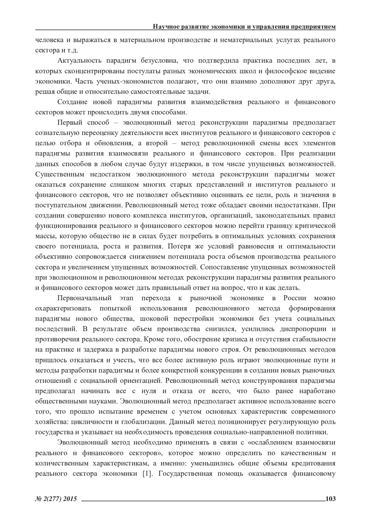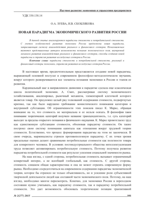 В данной статье анализируются парадигмы стоимости и потребительной стоимости. С учетом особенностей развития экономики России предложена новая парадигма, затрагивающая систему взаимодействия реального и финансового секторов. Немаловажным являются представленные автором возможности познания экономического поля, внутренний механизм развития взаимодействия реального и финансового секторов, способы создания новой парадигмы и стратегия развития исследуемых секторов в России