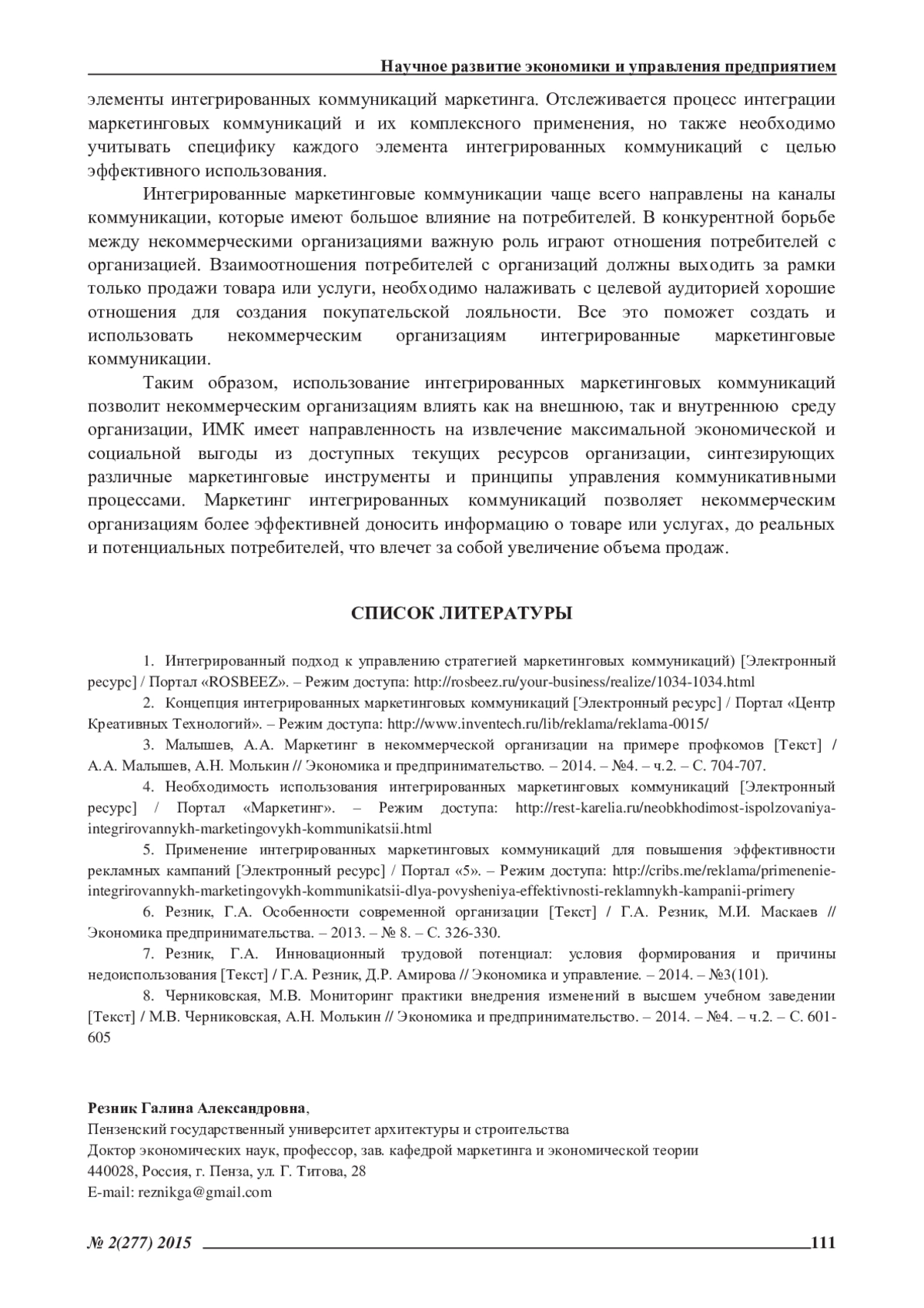 7. Резник, Г.А. Инновационный трудовой потенциал: условия формирования и причины недоиспользования [Текст] / Г.А. Резник, Д.Р. Амирова // Экономика и управление. - 2014. - №3(101). EDN: SBJNZN