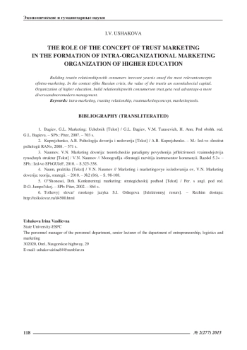 4. Наумов, В.Н. Маркетинг доверия: теория, стратегии, практика /В.Н. Наумов//Маркетинг и маркетинговые исследования. -2010. -№2 (86). -С. 98-108. EDN: LKDUHX