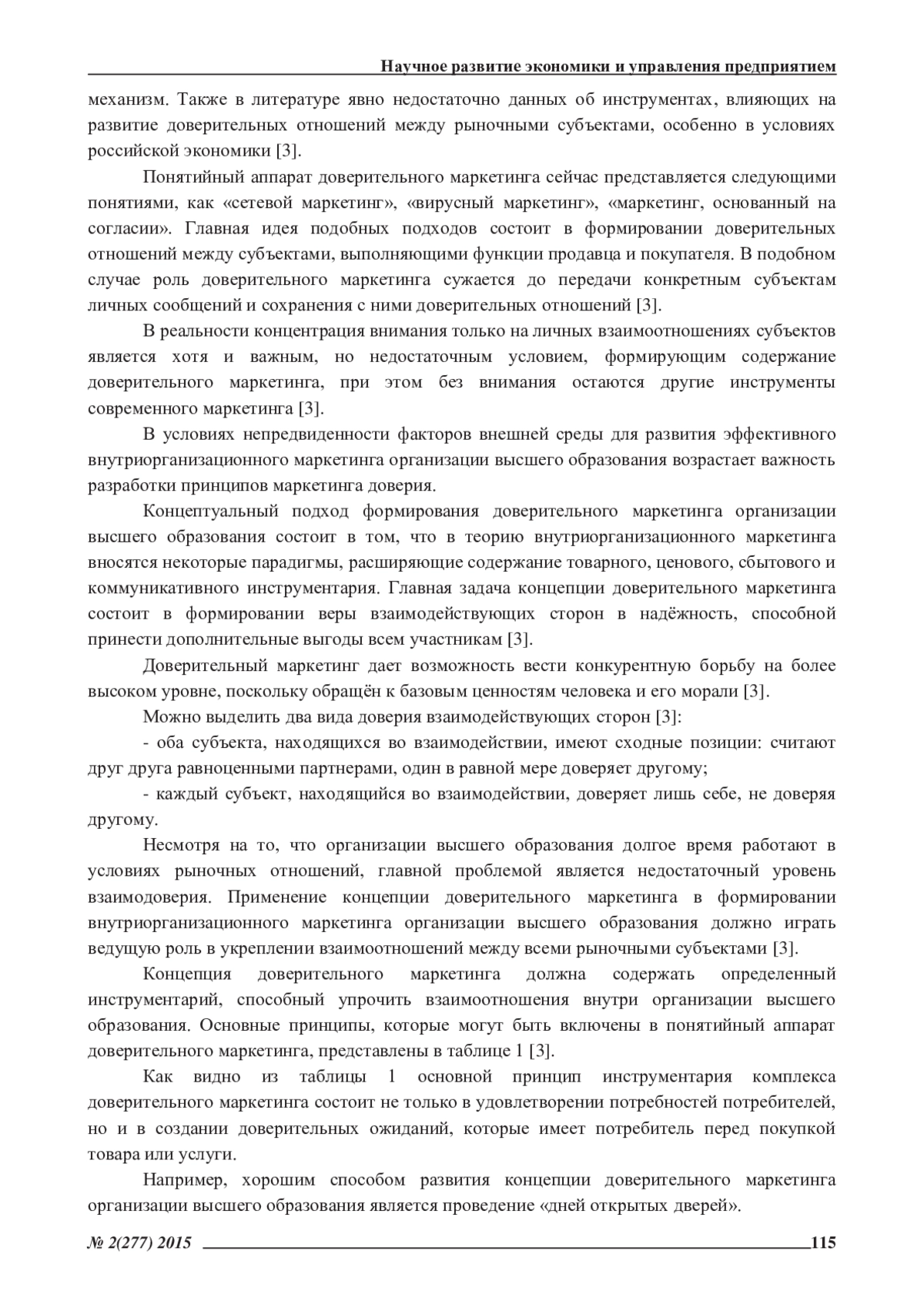 Формирование доверия во взаимоотношениях с потребителями в последнее время является одной из наиболее актуальных концепций внутриорганизационного маркетинга. В условиях российского кризиса, значение доверия выступает существенным социальным капиталом. Организации высшего образования, построившие отношения с потребителями на доверии, получают реальное преимущество – более разнообразный и более современный менеджмент