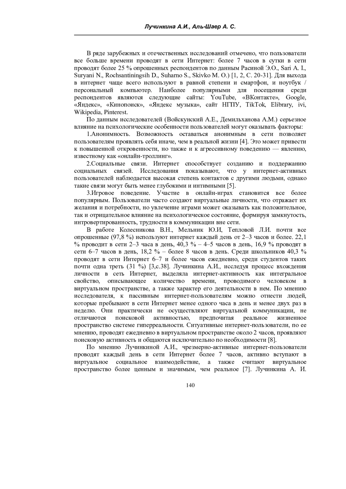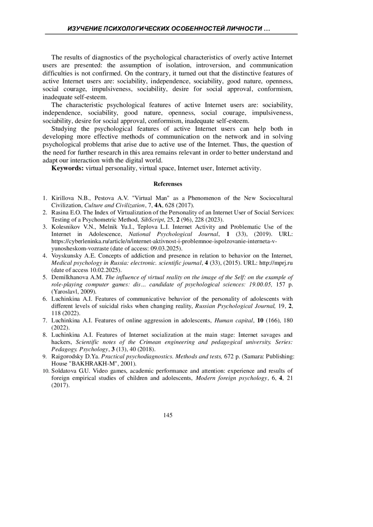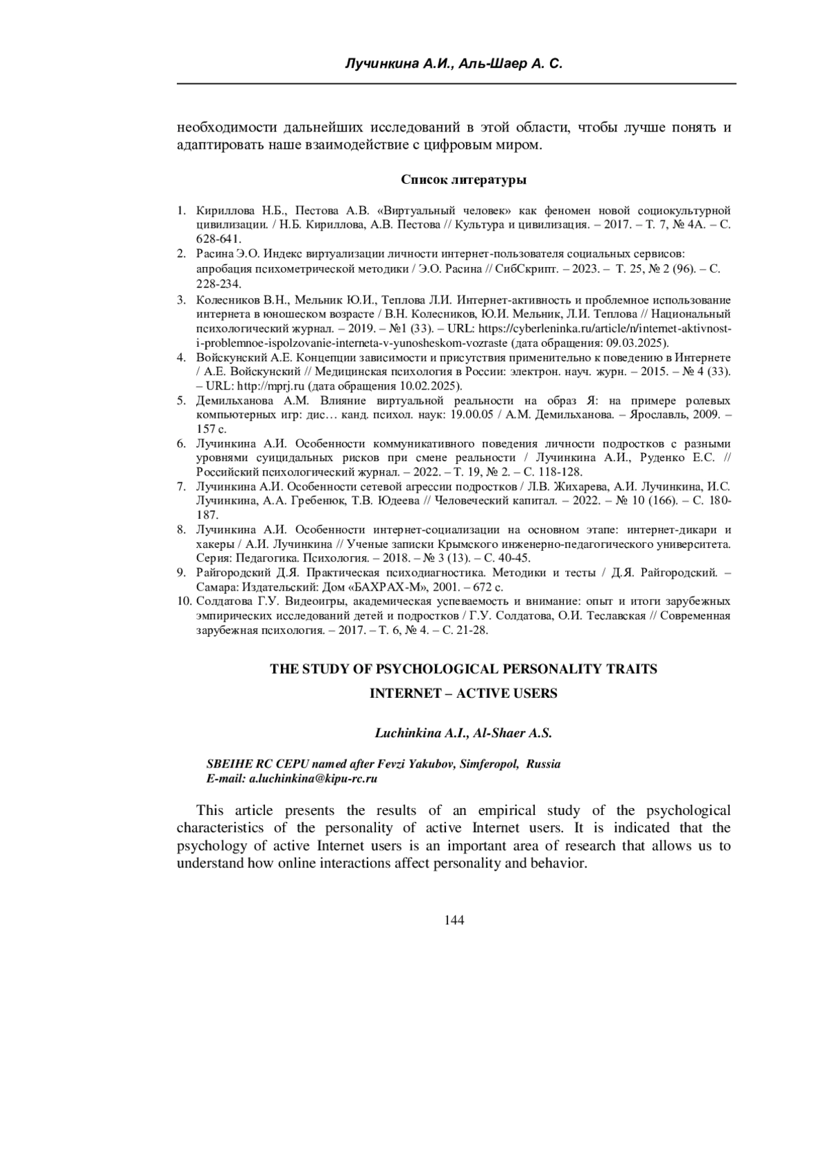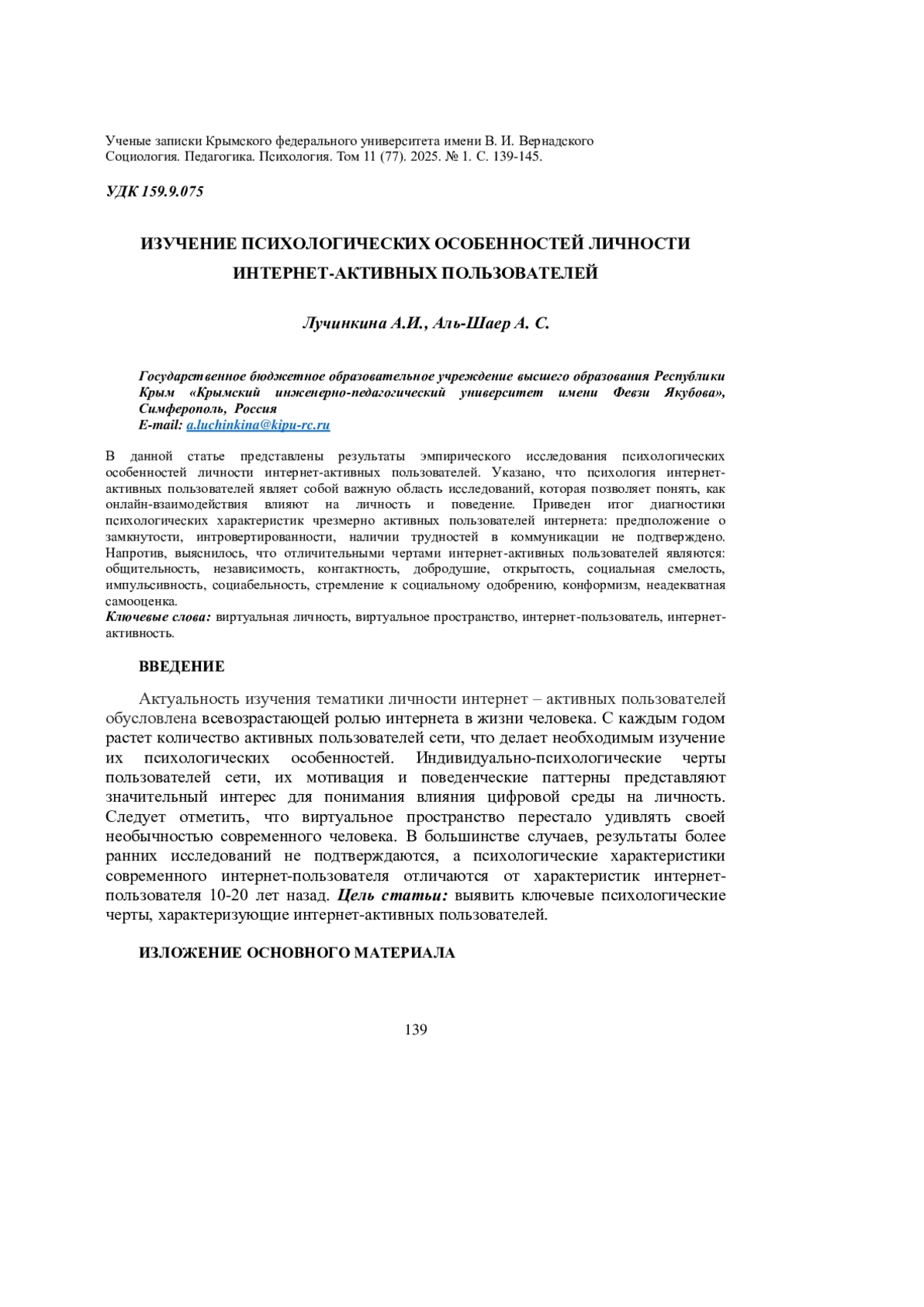 ЛУЧИНКИНА А. И., АЛЬ-ШАЕР А. С. ИЗУЧЕНИЕ ПСИХОЛОГИЧЕСКИХ ОСОБЕННОСТЕЙ ЛИЧНОСТИ ИНТЕРНЕТ-АКТИВНЫХ ПОЛЬЗОВАТЕЛЕЙ // УЧЕНЫЕ ЗАПИСКИ КРЫМСКОГО ФЕДЕРАЛЬНОГО УНИВЕРСИТЕТА ИМЕНИ В. И. ВЕРНАДСКОГО. СОЦИОЛОГИЯ. ПЕДАГОГИКА. ПСИХОЛОГИЯ. 2025. ТОМ 11 (77). № 1