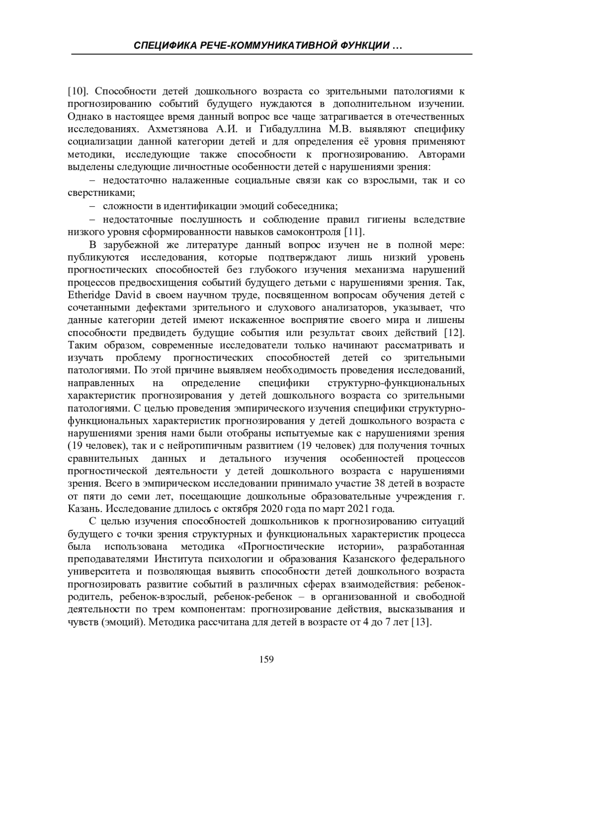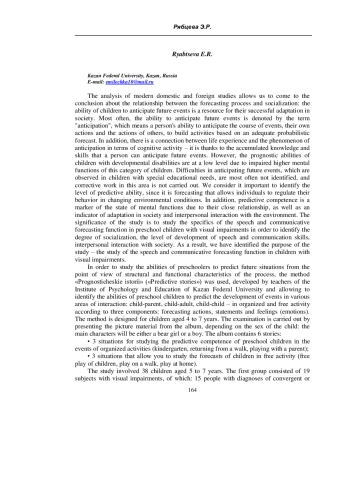 Анализ современных отечественных и зарубежных исследований позволяет прийти к выводу о взаимосвязи процесса прогнозирования и социализации: способность детей предвосхищать события будущего является ресурсом их успешной адаптации в социуме. Целью работы являлось изучение рече-коммуникативной функции прогнозирования у детей с нарушениями зрения. Нами была использована методика «Прогностические истории», разработанная преподавателями Казанского федерального университета, позволяющая выявить способности детей дошкольного возраста прогнозировать развитие событий в различных сферах взаимодействия. В исследовании приняли участие 38 детей в возрасте от 5 до 7 лет (19 детей с нарушениями зрения и 19 детей без патологии зрения). Выявлены низкие показатели критерий рече-коммуникативной функции прогнозирования у детей с нарушениями зрения, проявляющиеся главным образом в односложной речи и аграмматизмах.