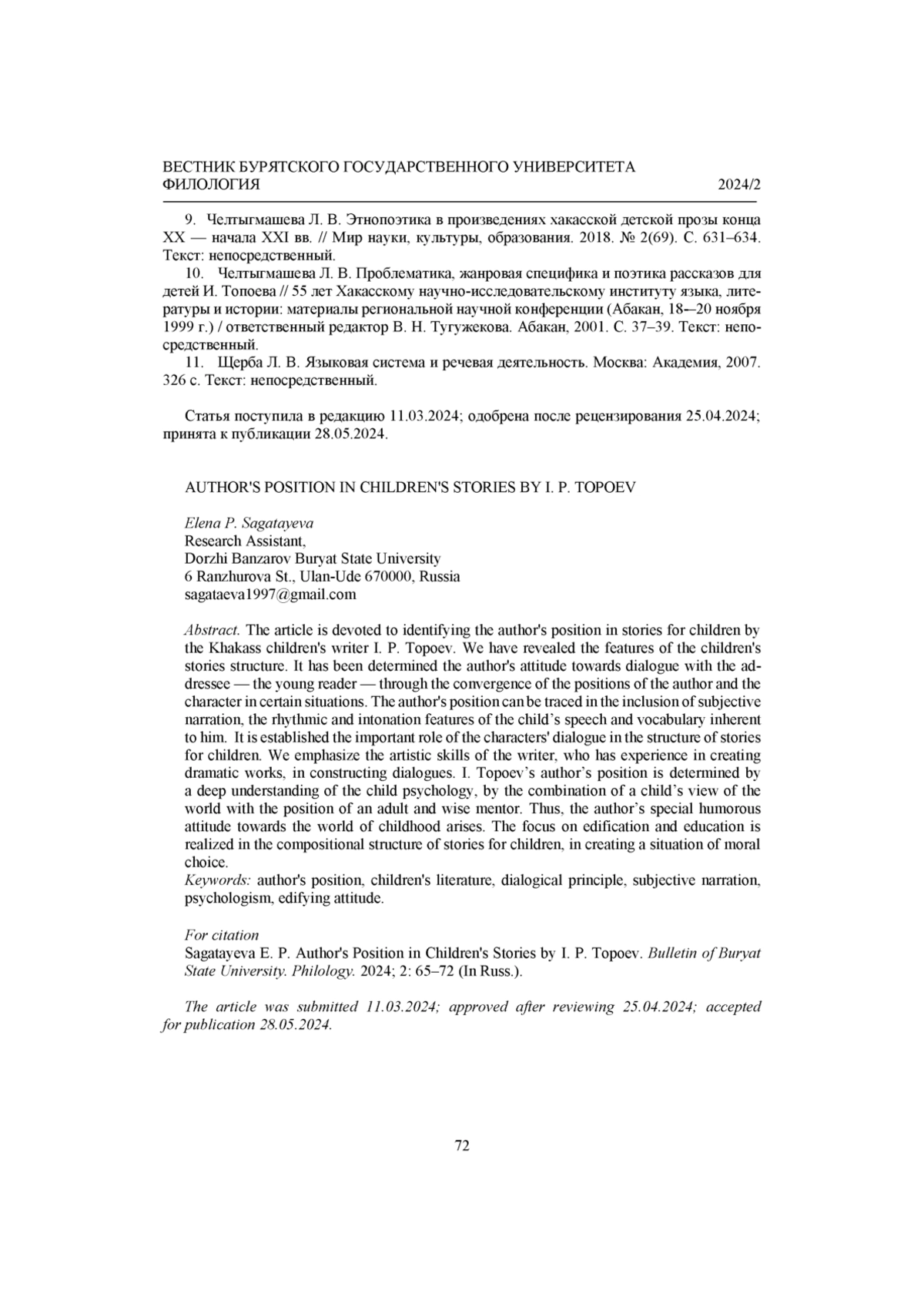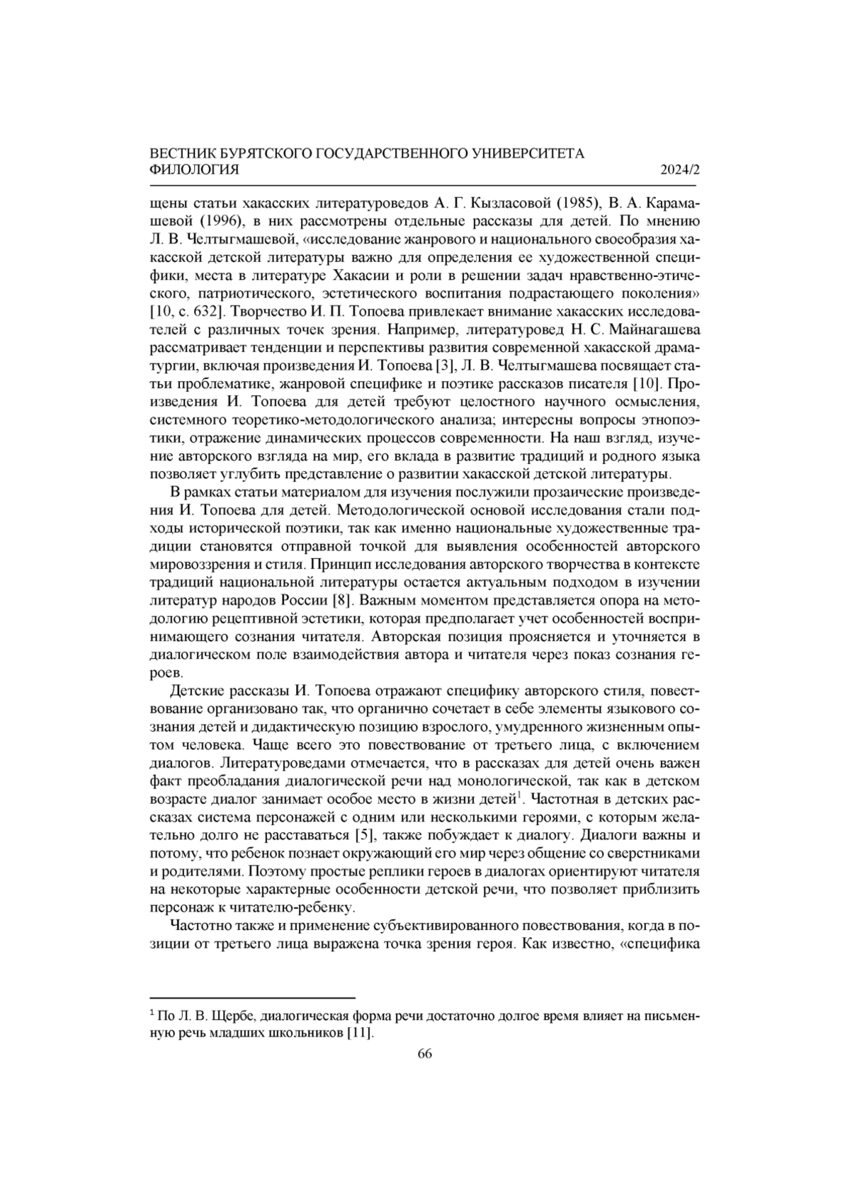 10. Челтыгмашева Л. В. Проблематика, жанровая специфика и поэтика рассказов для детей И. Топоева // 55 лет Хакасскому научно-исследовательскому институту языка, литературы и истории: материалы региональной научной конференции (Абакан, 18-20 ноября 1999 г.) / ответственный редактор B. Н. Тугужекова. Абакан, 2001. С. 37-39. Текст: непосредственный.