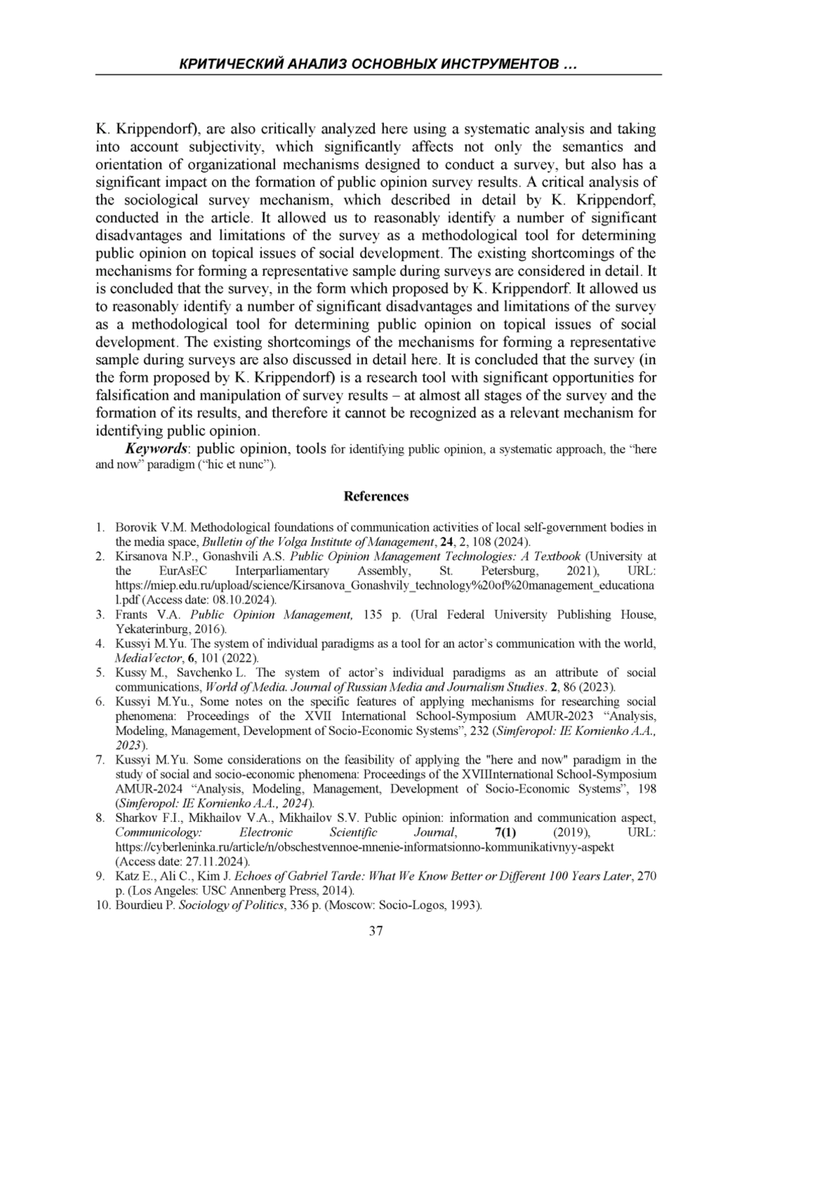 6. Куссый М.Ю. Некоторые заметки о специфических особенностях применения механизмов исследований социальных феноменов / М.Ю. Куссый // Анализ, моделирование, управление, развитие социально-экономических систем: сборник научных трудов ХVII Международной школы-симпозиума АМУР-2023 (Симферополь-Судак, 14-27 сентября 2023) / ред. совет: А. В. Сигал (предс.) и др. - Симферополь: ИП Корниенко А. А., 2023. - С. 232-240. EDN: SWMYGS