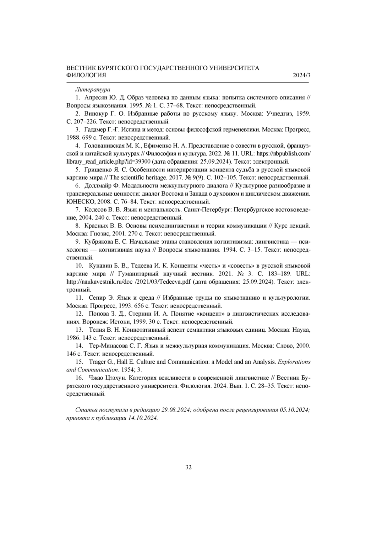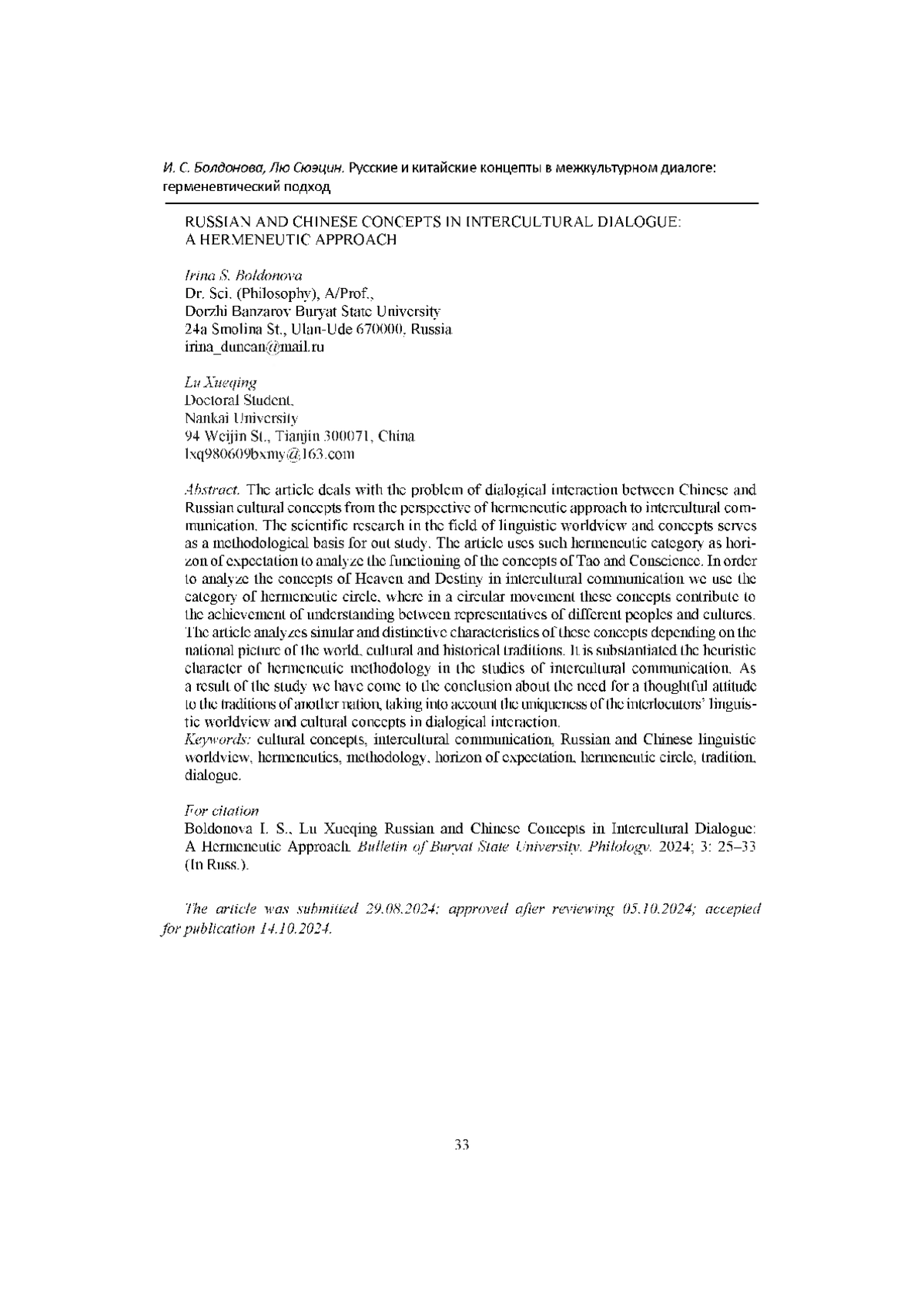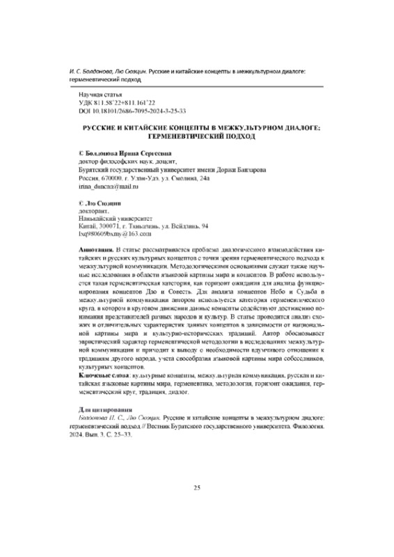 БОЛДОНОВА И. С., ЛЮ С. РУССКИЕ И КИТАЙСКИЕ КОНЦЕПТЫ В МЕЖКУЛЬТУРНОМ ДИАЛОГЕ: ГЕРМЕНЕВТИЧЕСКИЙ ПОДХОД // ВЕСТНИК БУРЯТСКОГО ГОСУДАРСТВЕННОГО УНИВЕРСИТЕТА. ФИЛОЛОГИЯ. 2024. № 3