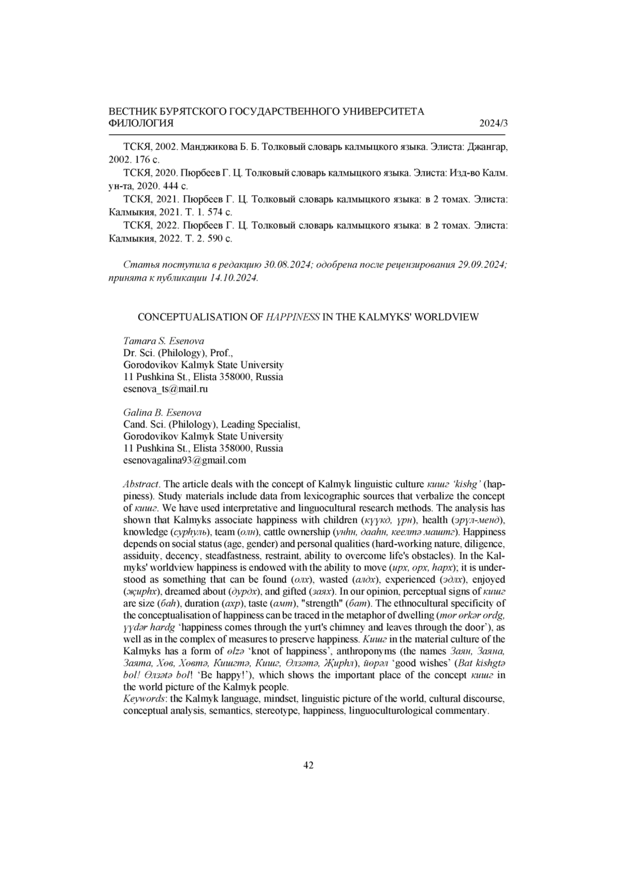 ЕСЕНОВА Т. С., ЕСЕНОВА Г. Б. КОНЦЕПТУАЛИЗАЦИЯ СЧАСТЬЯ В КАРТИНЕ МИРА КАЛМЫКОВ // ВЕСТНИК БУРЯТСКОГО ГОСУДАРСТВЕННОГО УНИВЕРСИТЕТА. ФИЛОЛОГИЯ. 2024. № 3