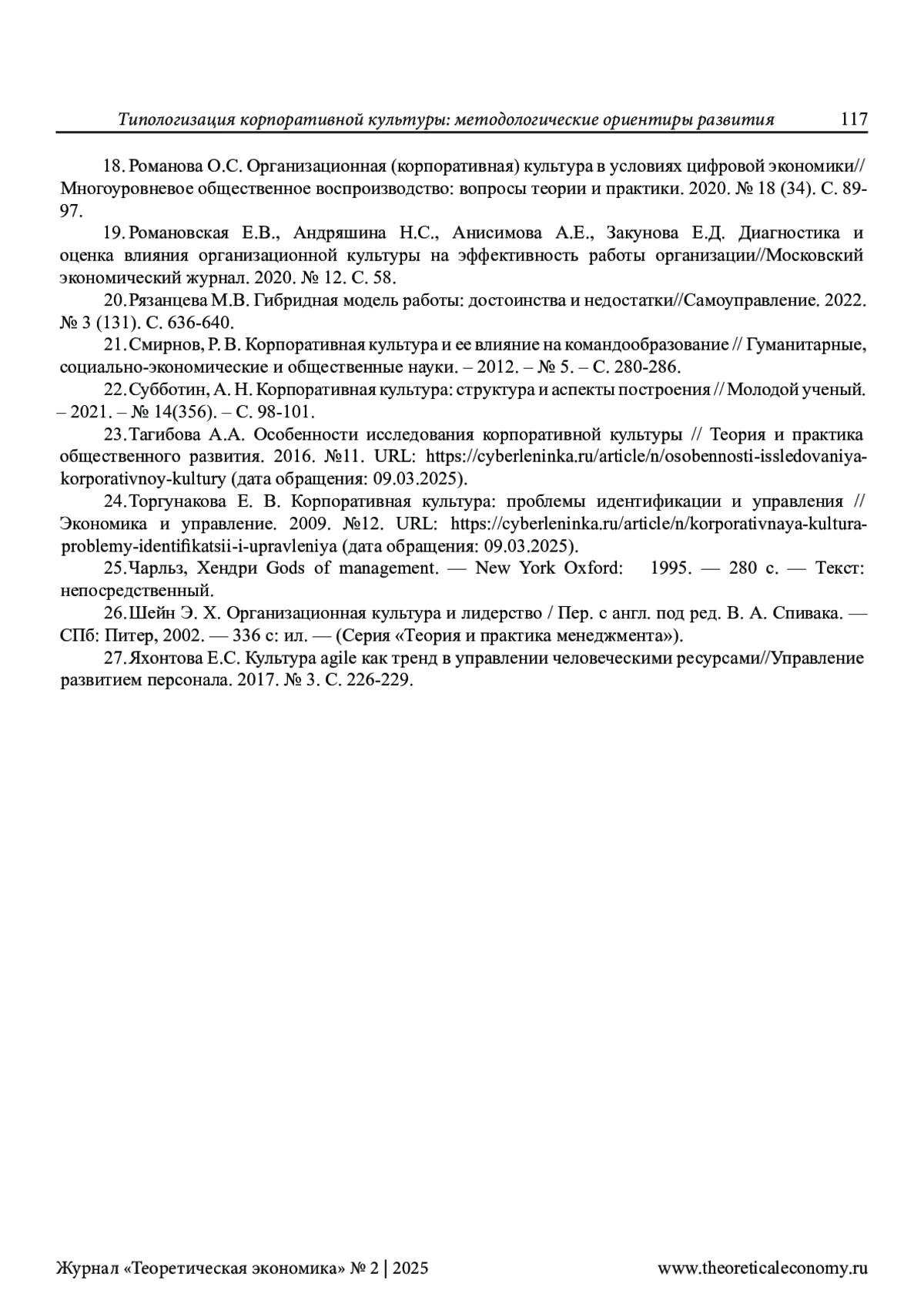 24. Торгунакова Е. В. Корпоративная культура: проблемы идентификации и управления // Экономика и управление. 2009. №12. URL: https://cyberleninka.ru/article/n/korporativnaya-kultura-problemy-identifikatsii-i-upravleniya (дата обращения: 09.03.2025). EDN: LAAGEX