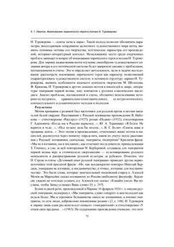 Идиостиль Н. Туроверова воплощает особенности менталитета донского казачества. Мироощущение лирического героя чаще всего совпадает с мировосприятием автора в стихотворениях. Поэт не принимает обозначение прощания с Россией как эмиграции, вкладывая в эту лексему отрицательные коннотации. Творческая индивидуальность поэта-казака, поэта-воина определила именование лирического героя: скиталец, пилигрим, казак, поэт, певец. Его герой нашел свой истинный путь пилигрима, возвращающегося к родным станицам, и это путь поэтический. Данный подход и обозначил особенности воплощения мотива прощания с Россией - прощание с вечной надеждой на возвращение. Именование лирического героя Н. Туроверова сформировалось под воздействием классической традиции, казачьего и эмигрантского контекстов. Эти художественные векторы и определили взаимодействие и оппозиция различных семантических единиц, обозначающих название лирического героя.