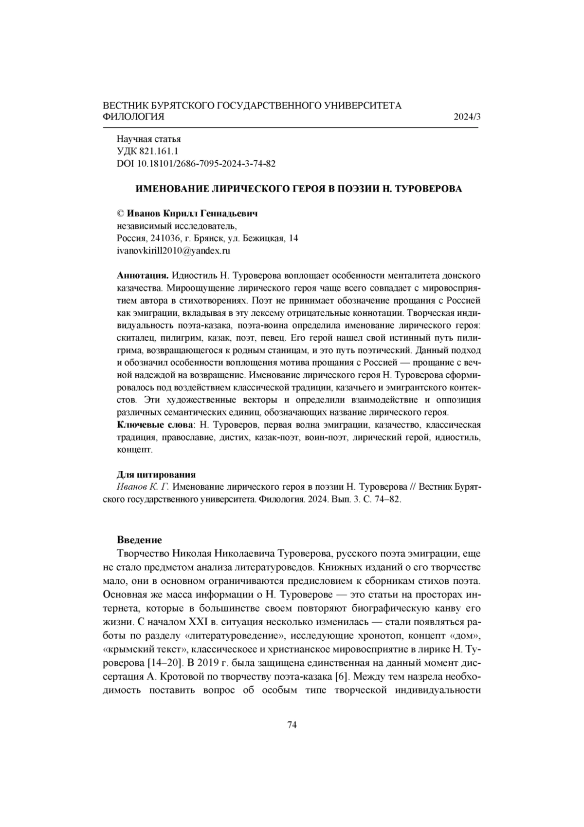 20. Кротова А. А. Особенности христианского мировосприятия в лирике Н. Н. Туроверова // Филологические науки. Вопросы теории и практики. 2017. № 9(75). Ч. 2. С. 34-36. Текст: непосредственный. EDN: ZFDRWR