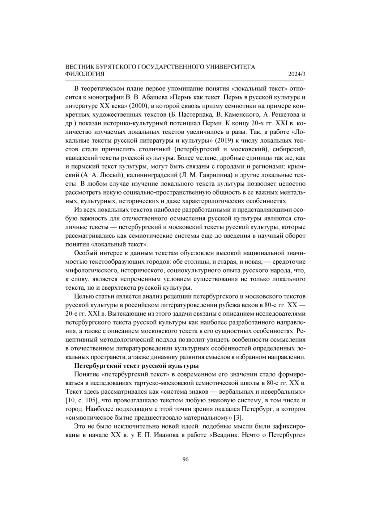Одним из актуальных направлений современного литературоведения является изучение локальных текстов русской культуры. Развивающаяся в рамках структурно-семиотического подхода идея локальных текстов культуры сформировалась сравнительно недавно, но уже обрела достаточную известность.