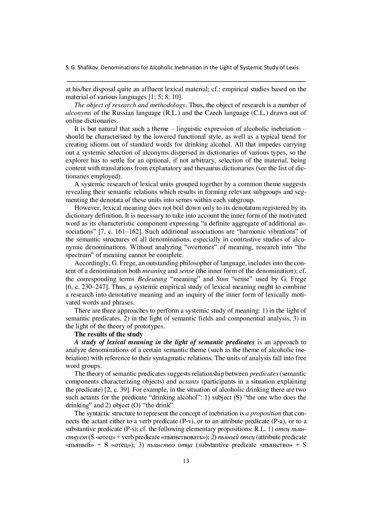 Статья посвящена сравнительной типологии эквивалентных глаголов в русском и чешском языках, связанных с употреблением хмельных напитков. Анализ материала включает исследование денотативного значения глаголов опьянения, а также мотивирующих признаков, составляющих внутреннюю форму этих глаголов в языках сравнения. Исследование проводится с помощью интегративного подхода, объединяющего теорию семантических предикатов, теорию семантического поля, теорию комбинаторной семантики и теорию прототипов. Такой подход позволяет представить результаты поэтапного анализа в виде опыта сравнительной типологии, в частности типологии синтаксических отношений между семантическим предикатом и его актантами, типологии компонентных структур в соответствии с выделяемыми компонентами лексического значения, типологии мотивирующих признаков, отражающих прототип именования.